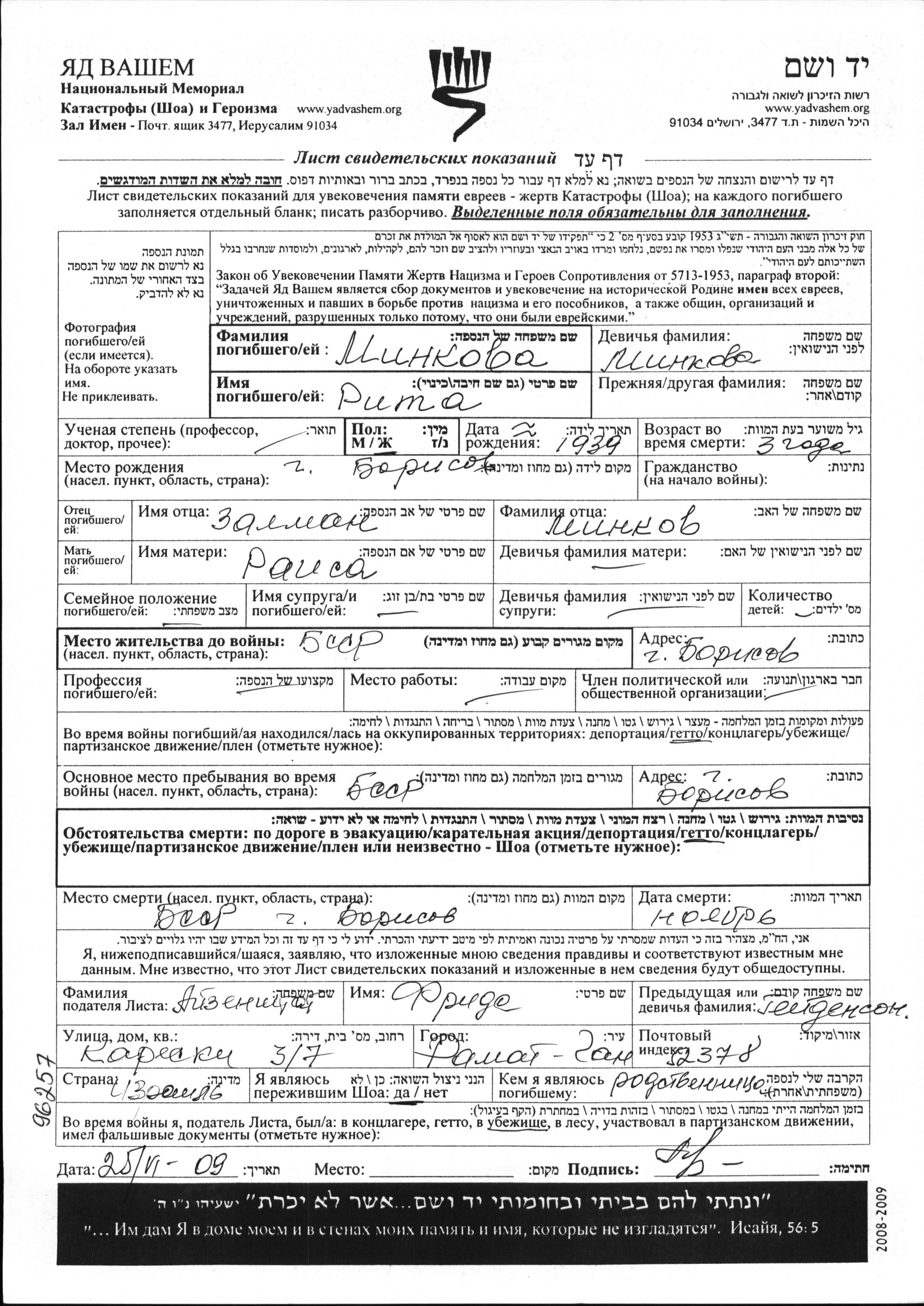 Минкова Рита 1939 Борисов, Белоруссия (СССР) Лист свидетельских показаний