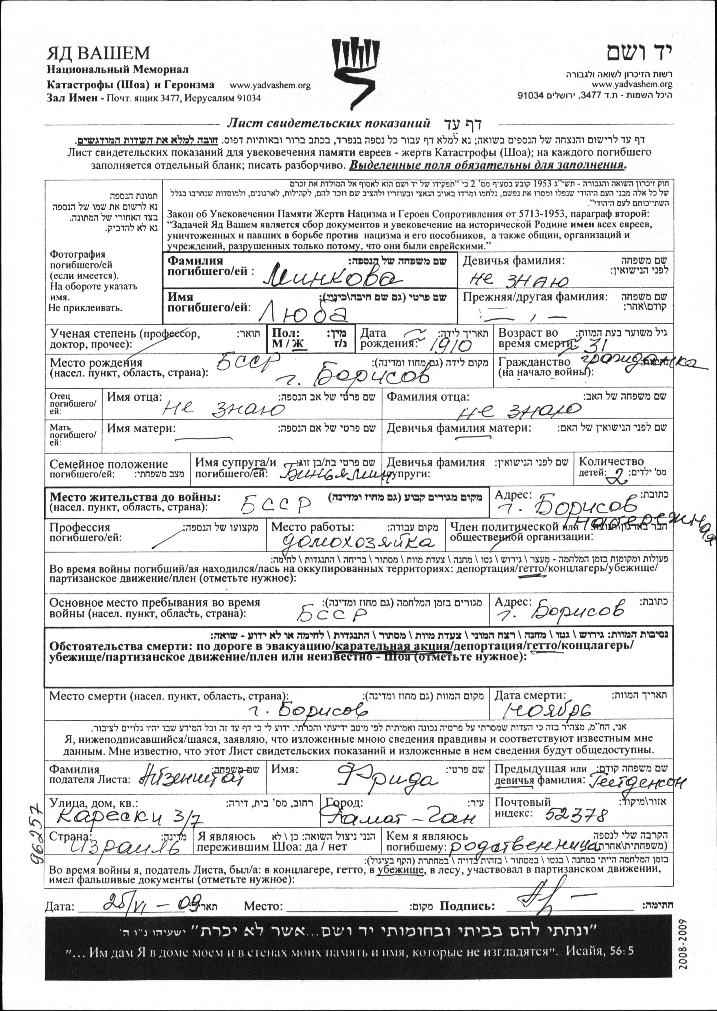Минкова Люба 1910 Борисов, Белоруссия (СССР) Лист свидетельских показаний