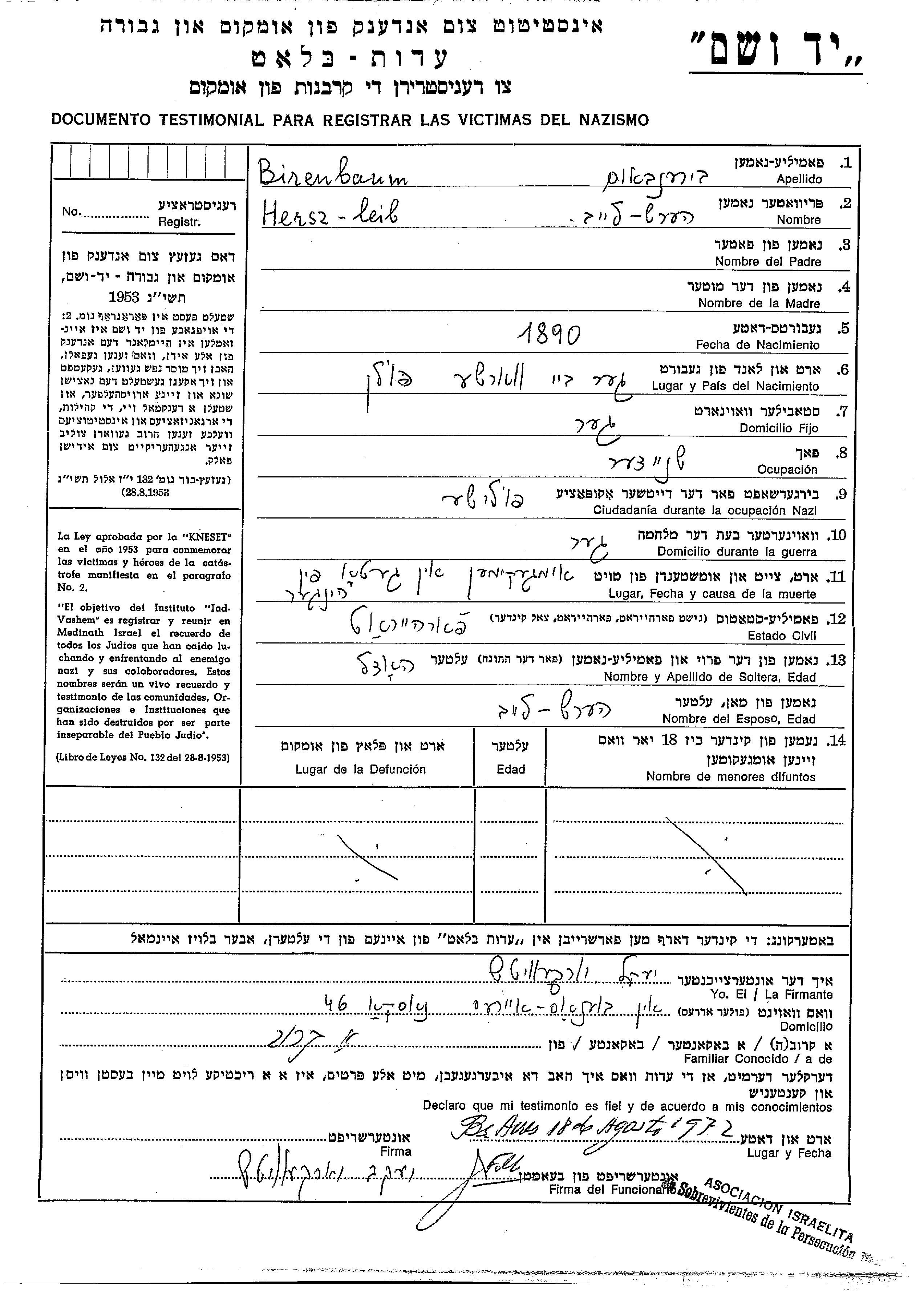 Биренбаум Герш Лейб 1890 Гора-Кальвария, Польша Лист свидетельских показаний