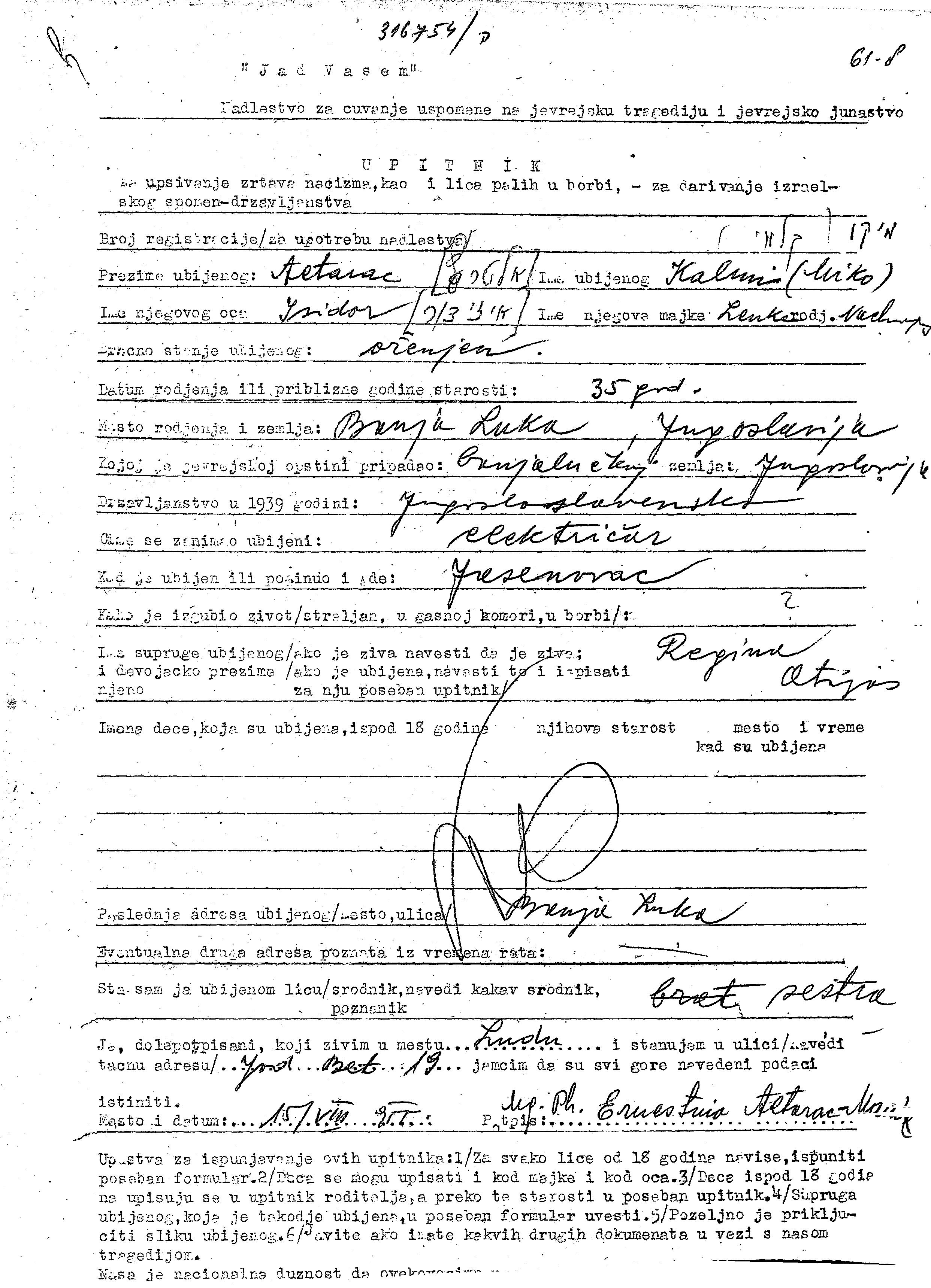 Альтарац Кальми Банья Лука, Югославия Лист свидетельских показаний