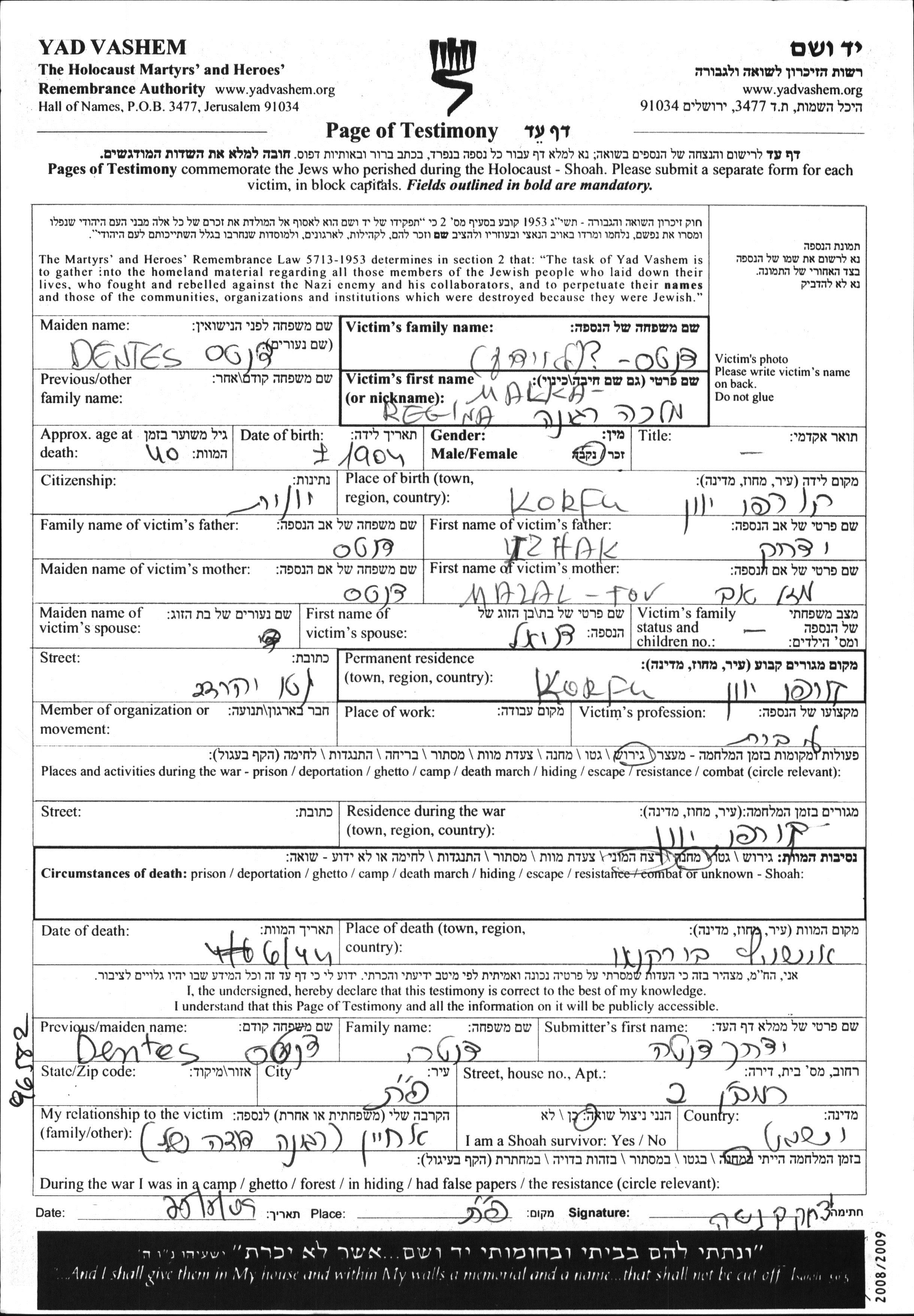 Яд Вашем - Листы свидетельских показаний Мемориального фонда