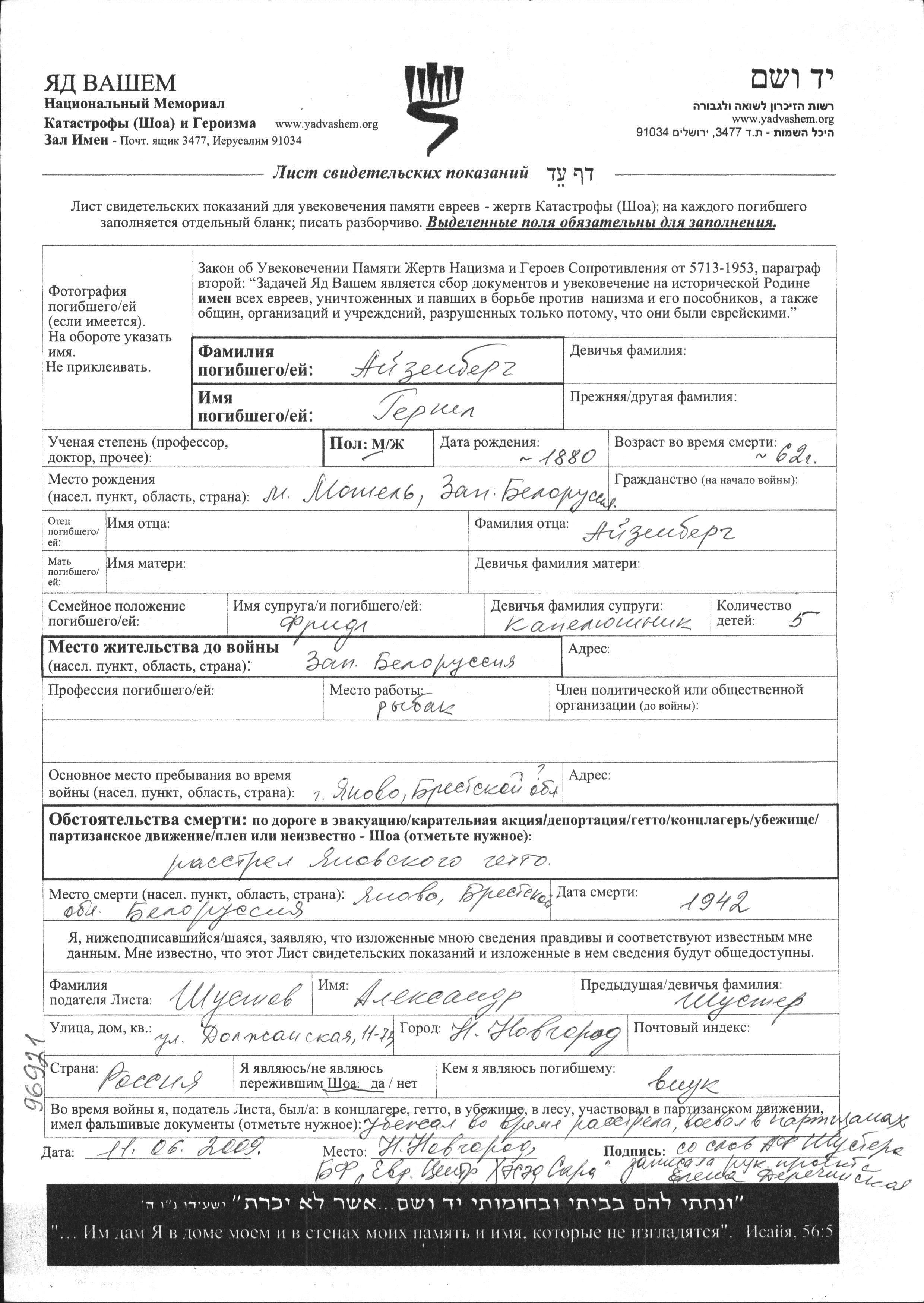 Гершл Айзенберг, место рождения: Мотоль, Польша. Rybak. Женат / замужем. Место жительства до войны: Полесье, Польша. Место во время войны: ГЕТТО.