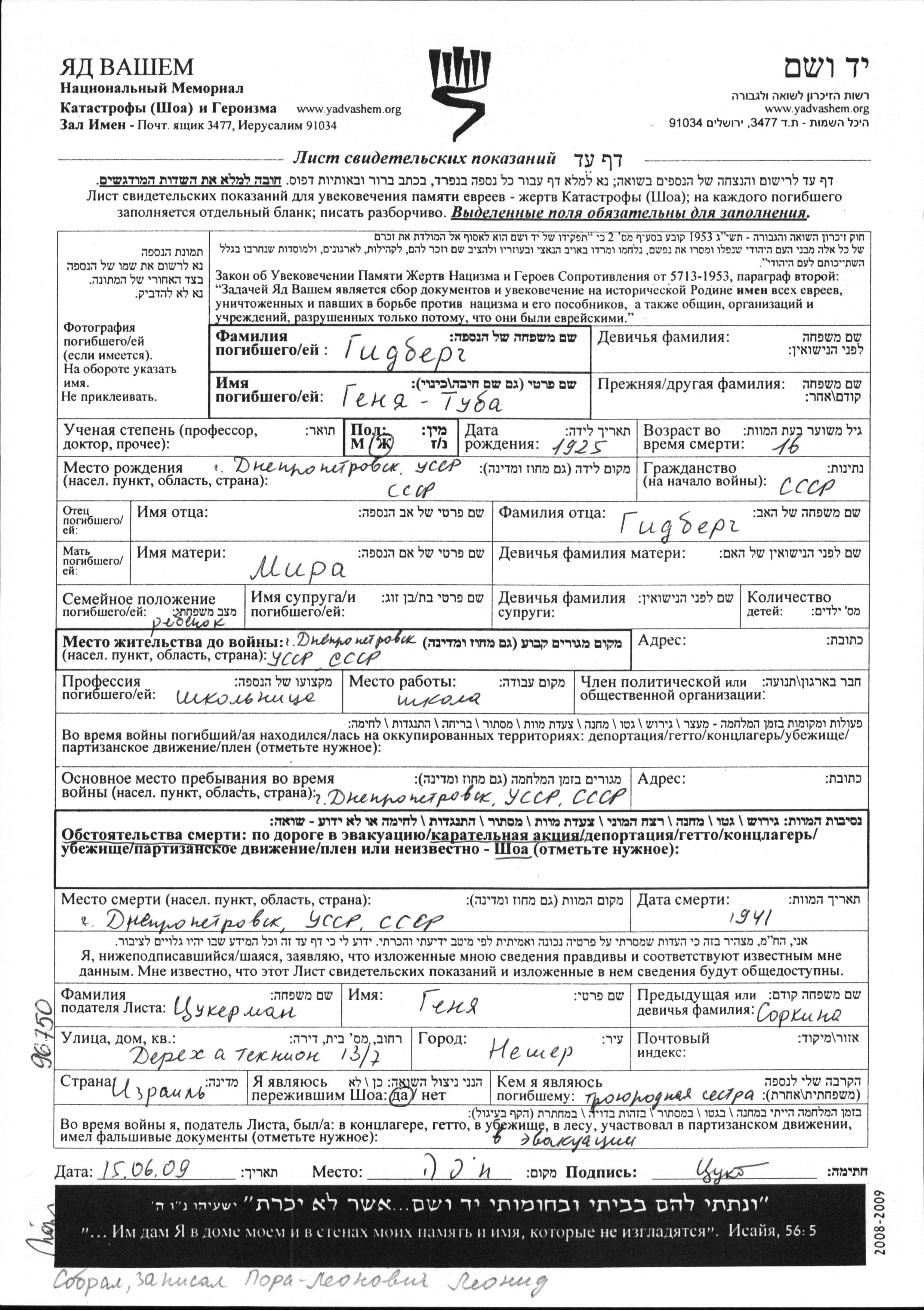Гидберг Геня Туба 1925 Днепропетровск, Украина (СССР) Лист свидетельских показаний
