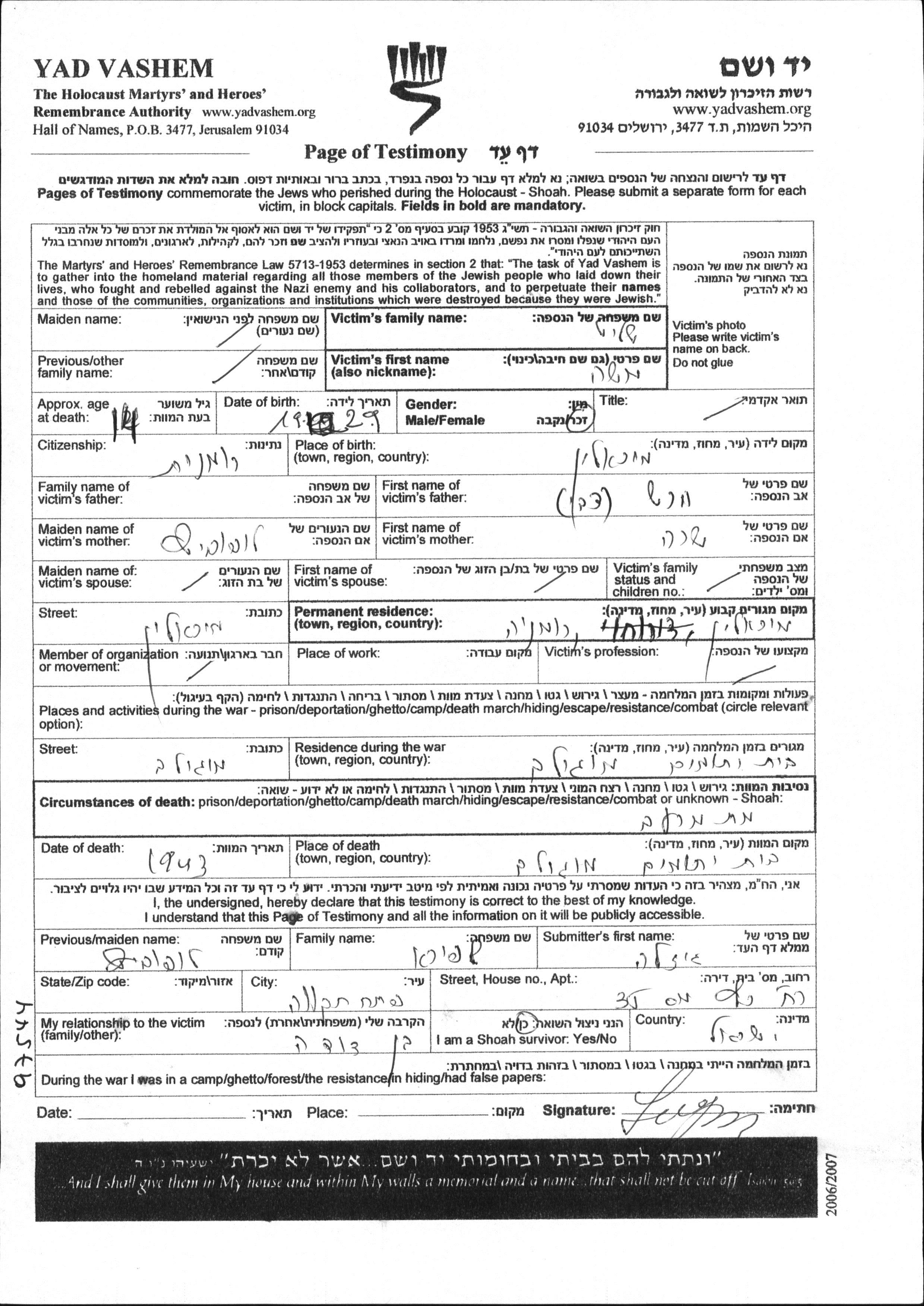 Яд Вашем - Листы свидетельских показаний Мемориального фонда