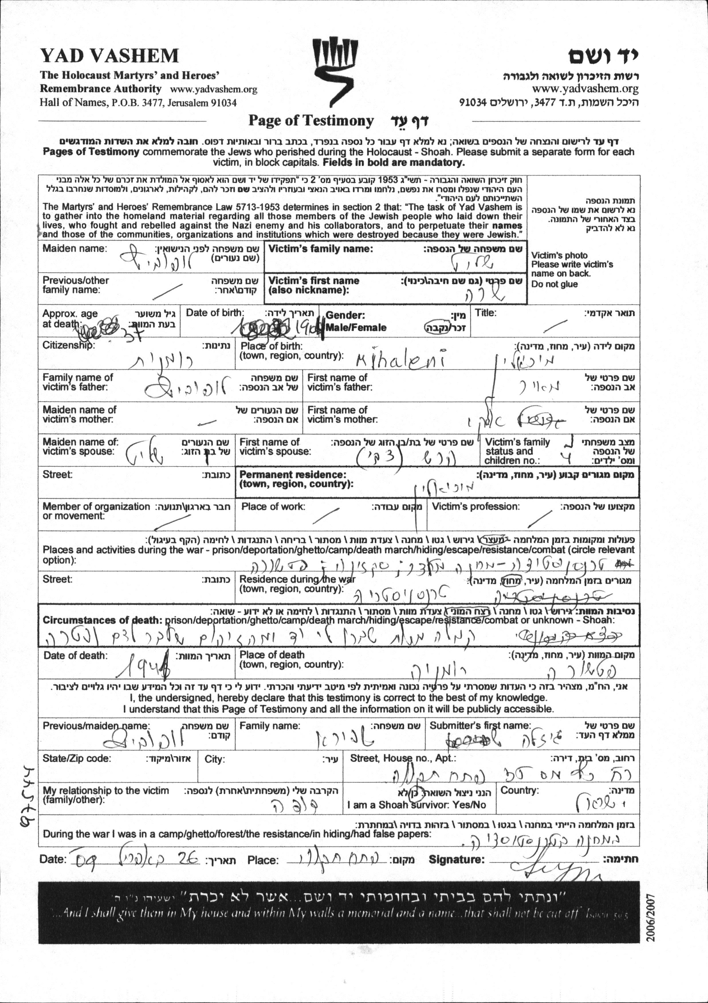 Яд Вашем - Листы свидетельских показаний Мемориального фонда