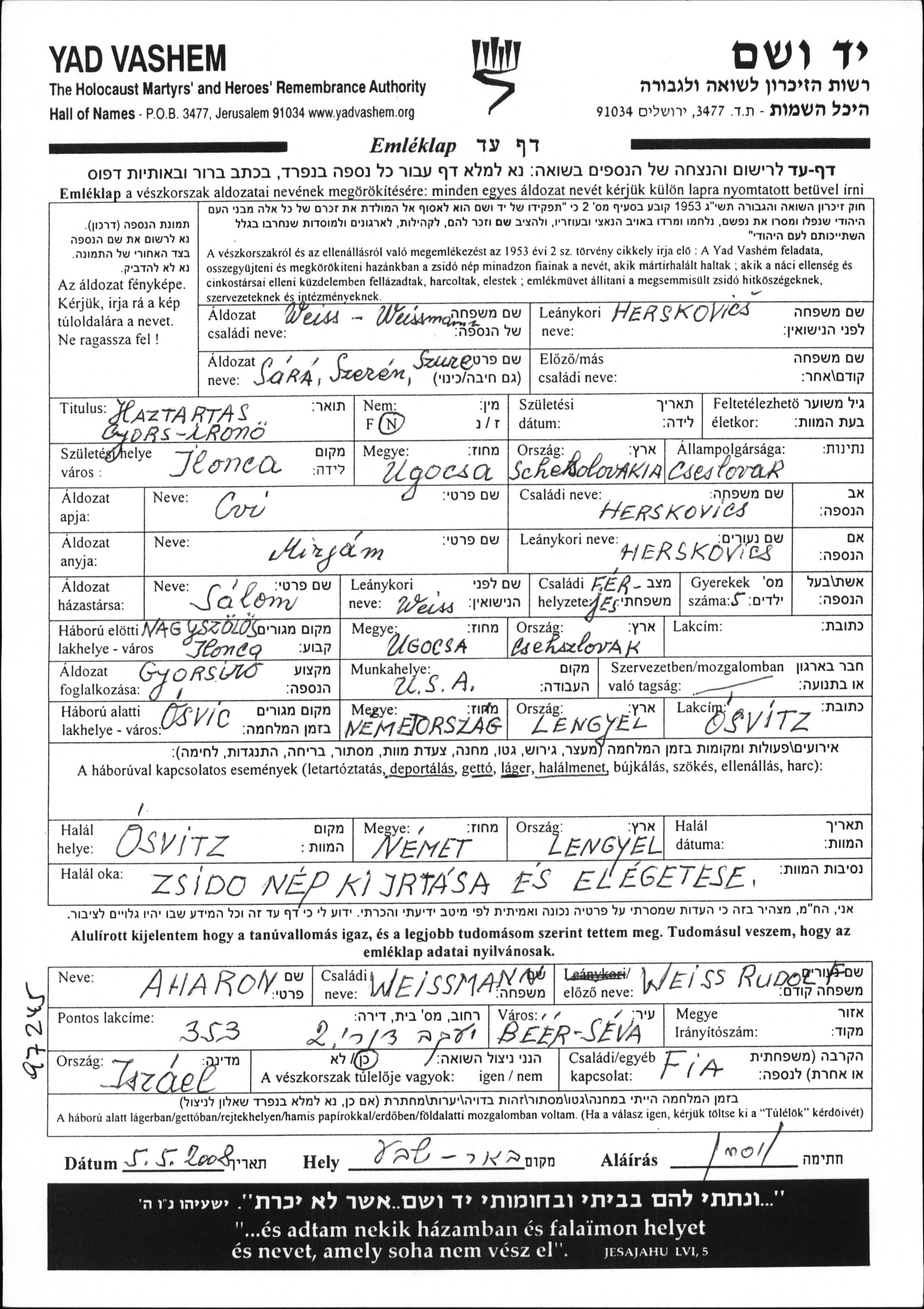 Сара Вайсс, девичья фамилия Хершковиц, место рождения: Илонца, Чехословакия. Отец: Цви, mать:Мирьям. Домашнее хозяйство. Женат / замужем. Место жительства до войны: Илонца, Чехословакия. Место во время войны: Илонца, Чехословакия.