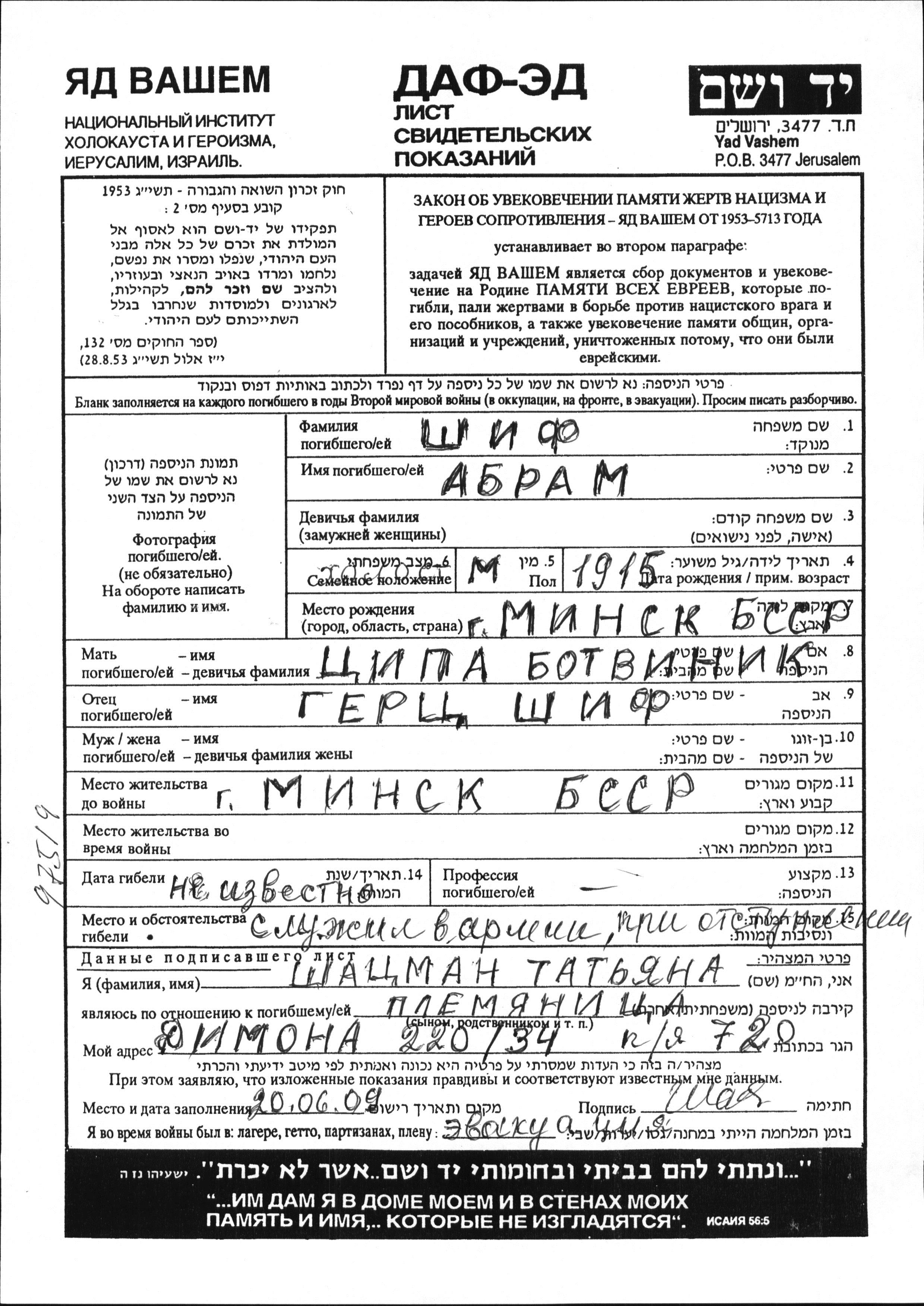 Абрам Шиф, место рождения: Минск, Белоруссия (СССР). Отец: Герц, mать:Ципа, девичья фамилия Ботвиник. Холост / не замужем. Место жительства до войны: Минск, Белоруссия (СССР). Место во время войны: Вооруженные силы Советского Союза. Абрам погиб на военной службе.