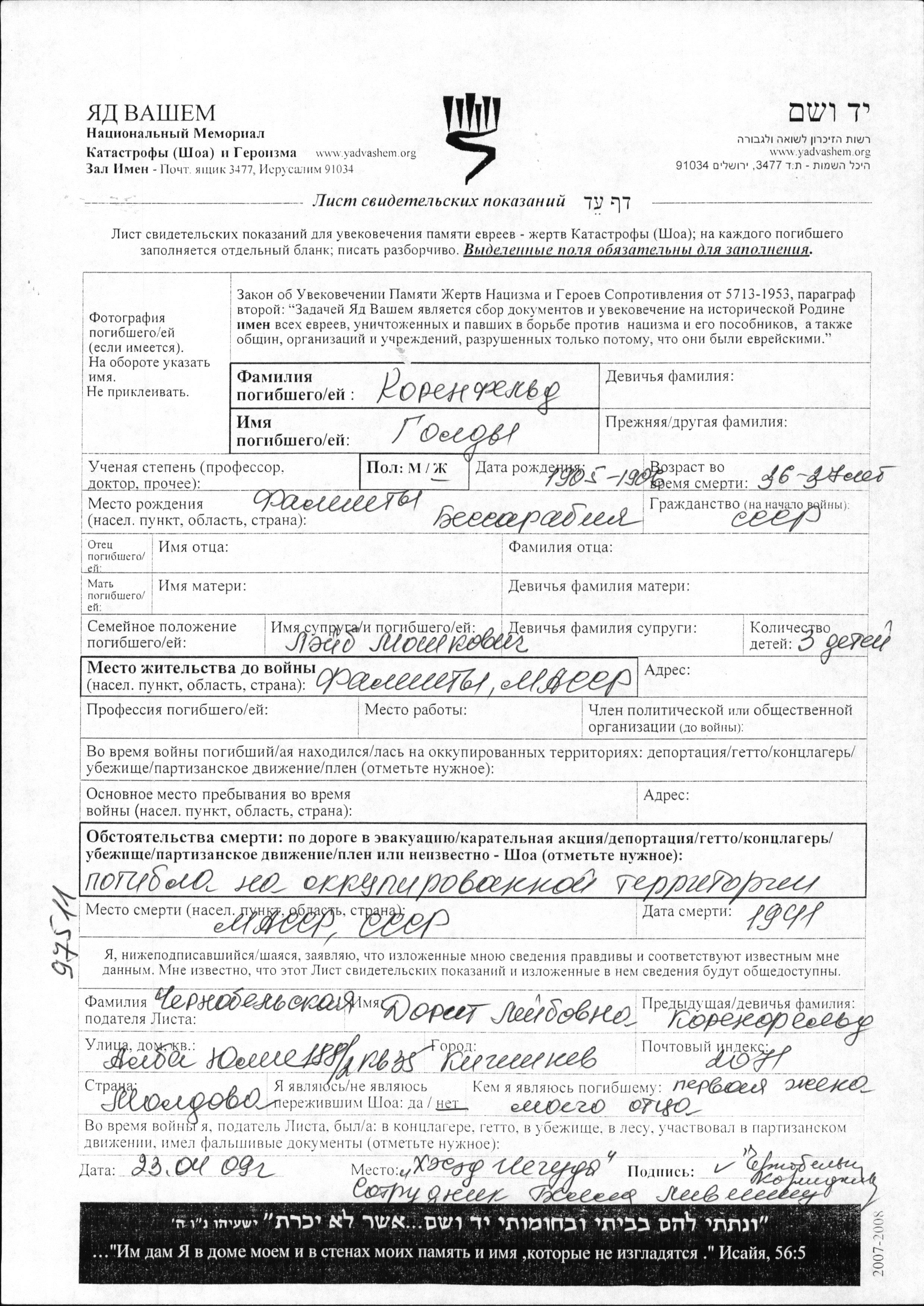 Яд Вашем - Листы свидетельских показаний Мемориального фонда