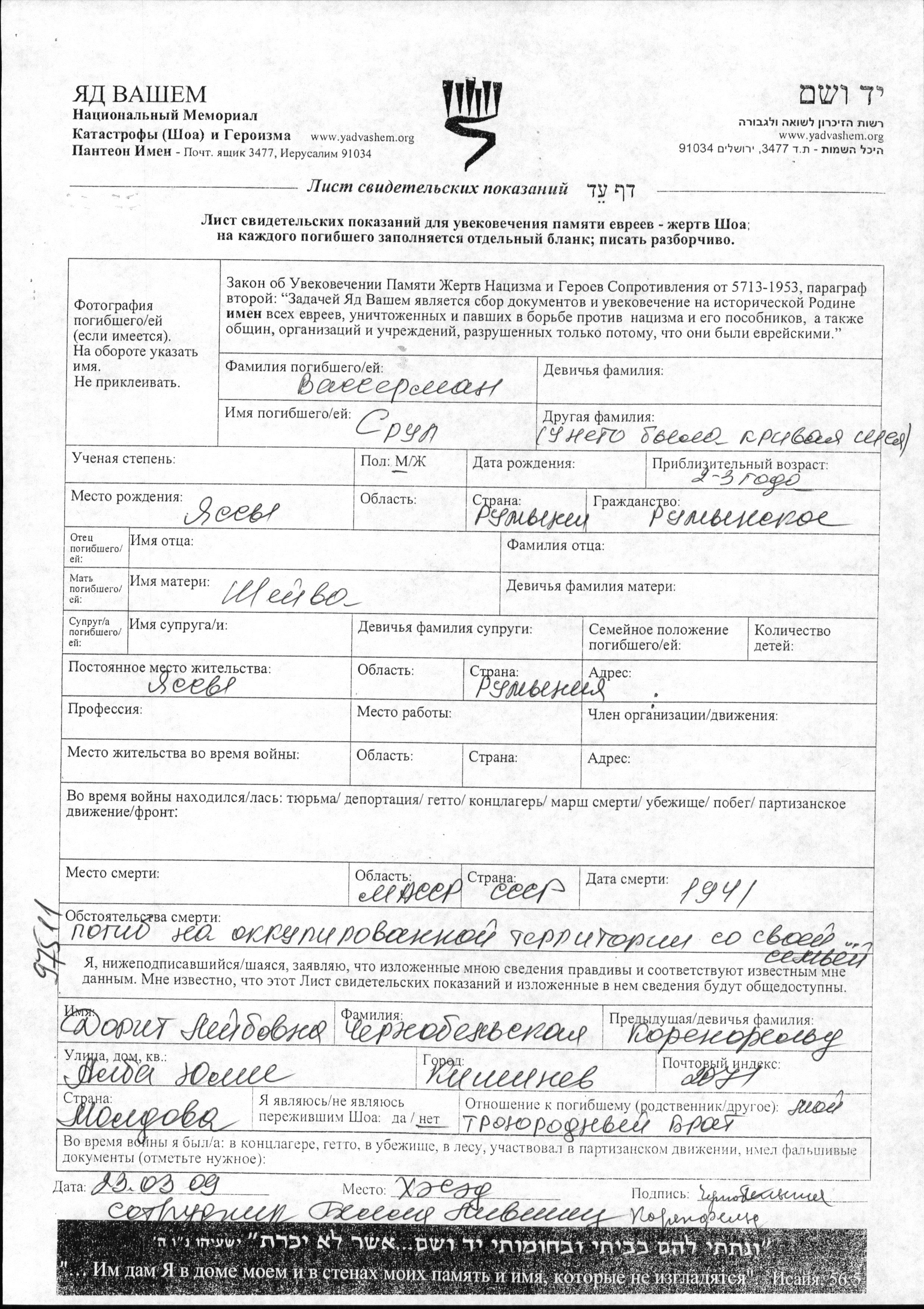 Яд Вашем - Листы свидетельских показаний Мемориального фонда