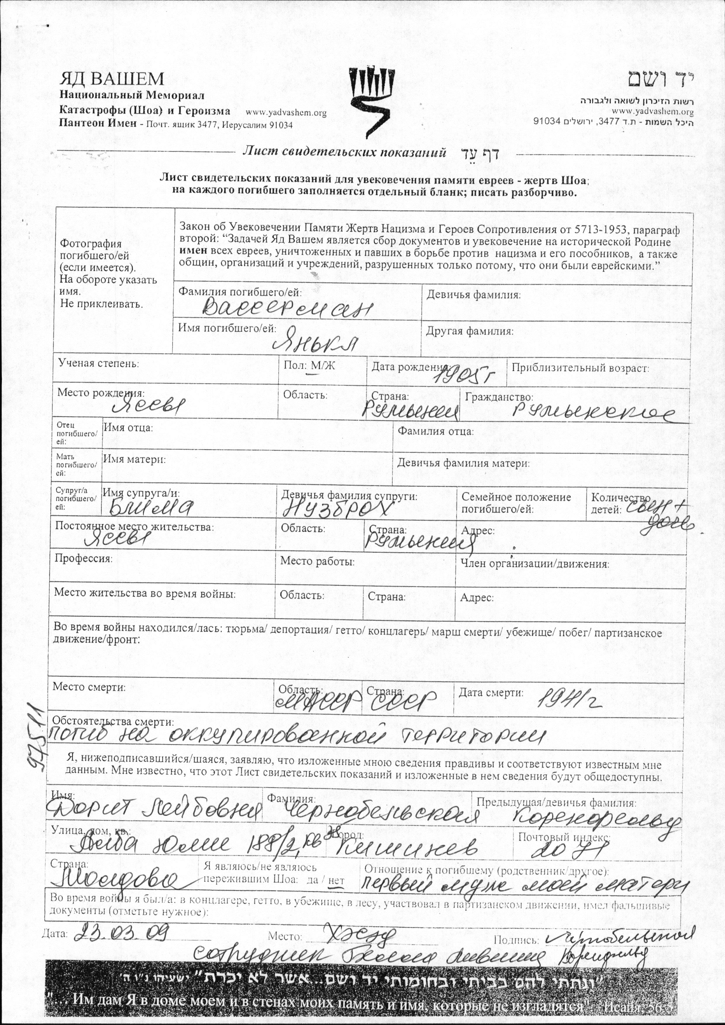 Яд Вашем - Листы свидетельских показаний Мемориального фонда