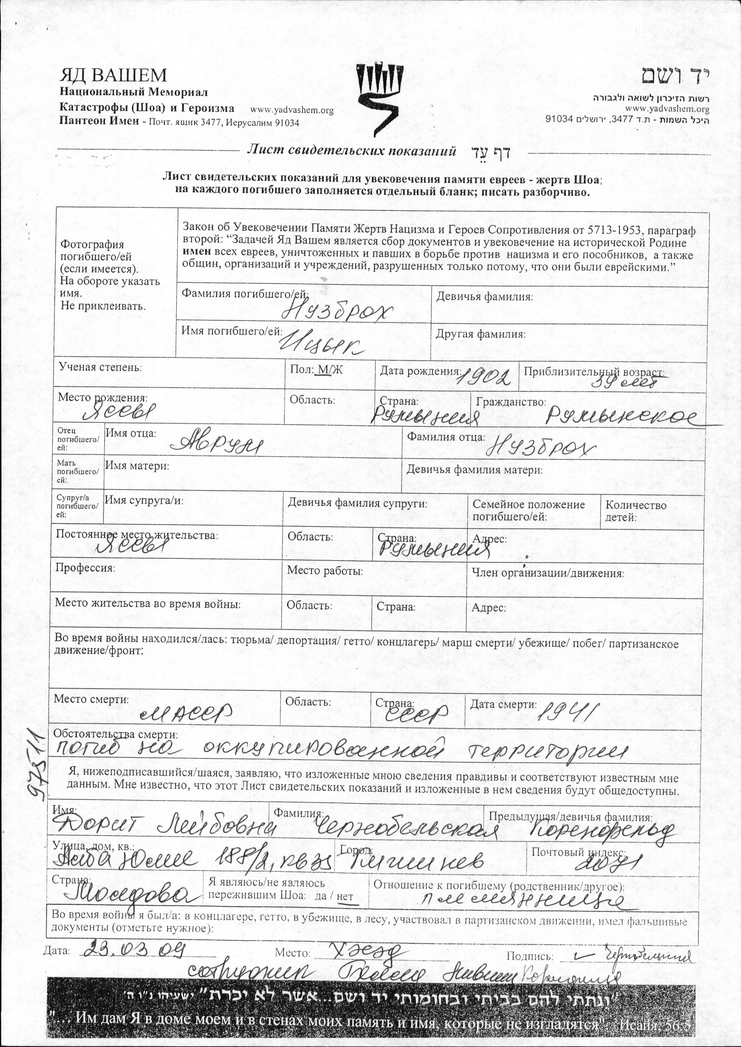 Яд Вашем - Листы свидетельских показаний Мемориального фонда