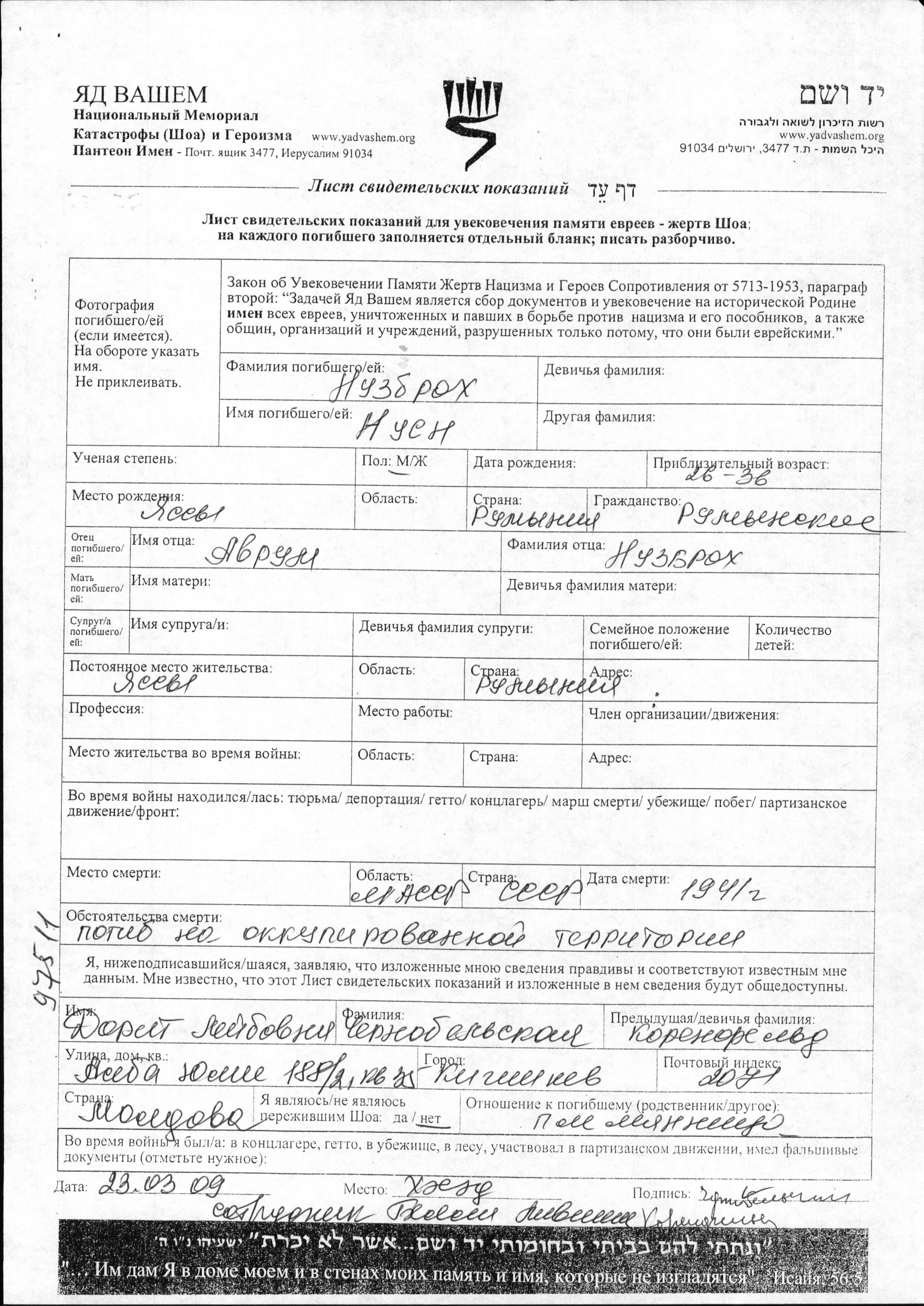 Яд Вашем - Листы свидетельских показаний Мемориального фонда