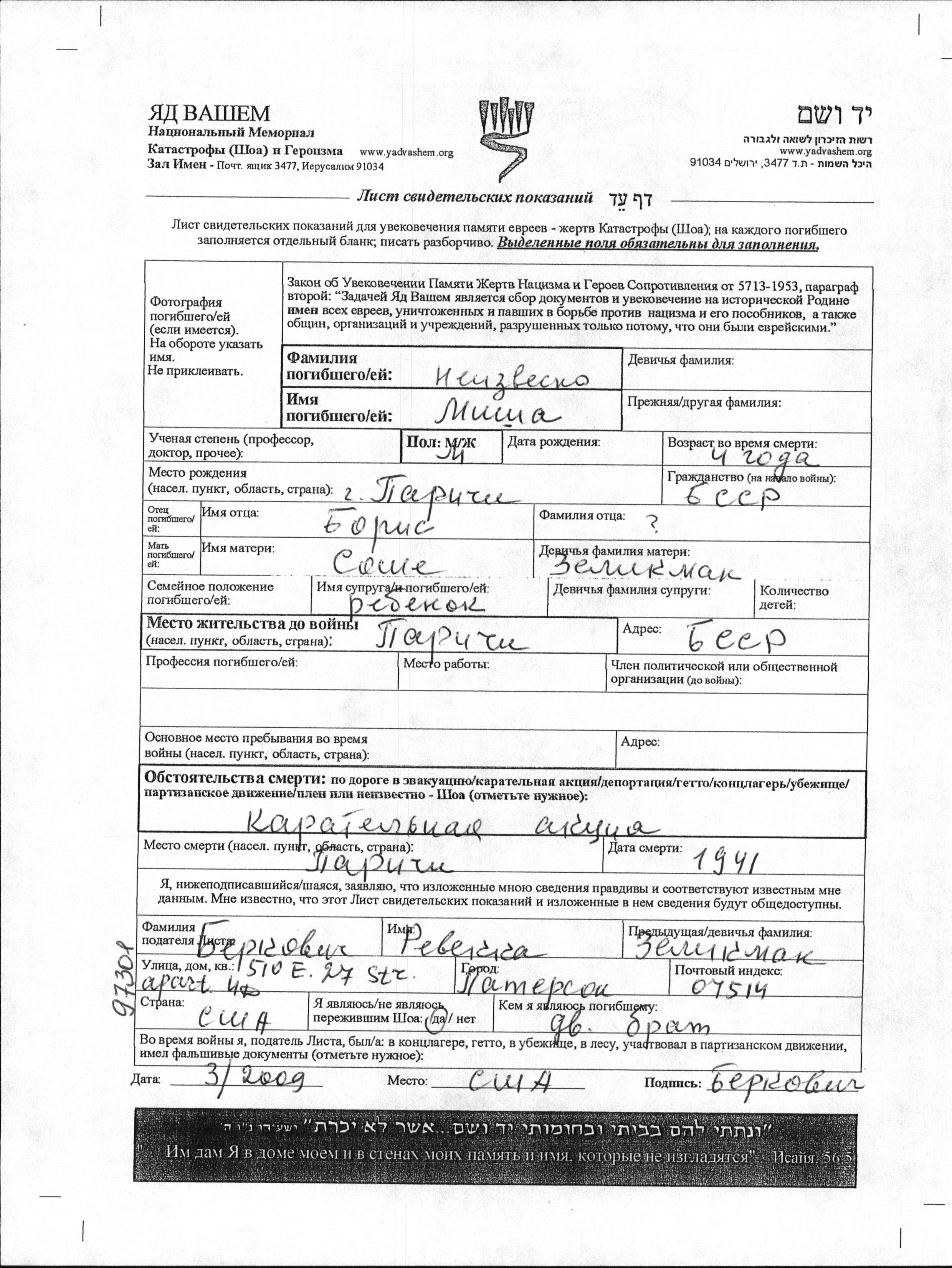 Яд Вашем - Листы свидетельских показаний Мемориального фонда