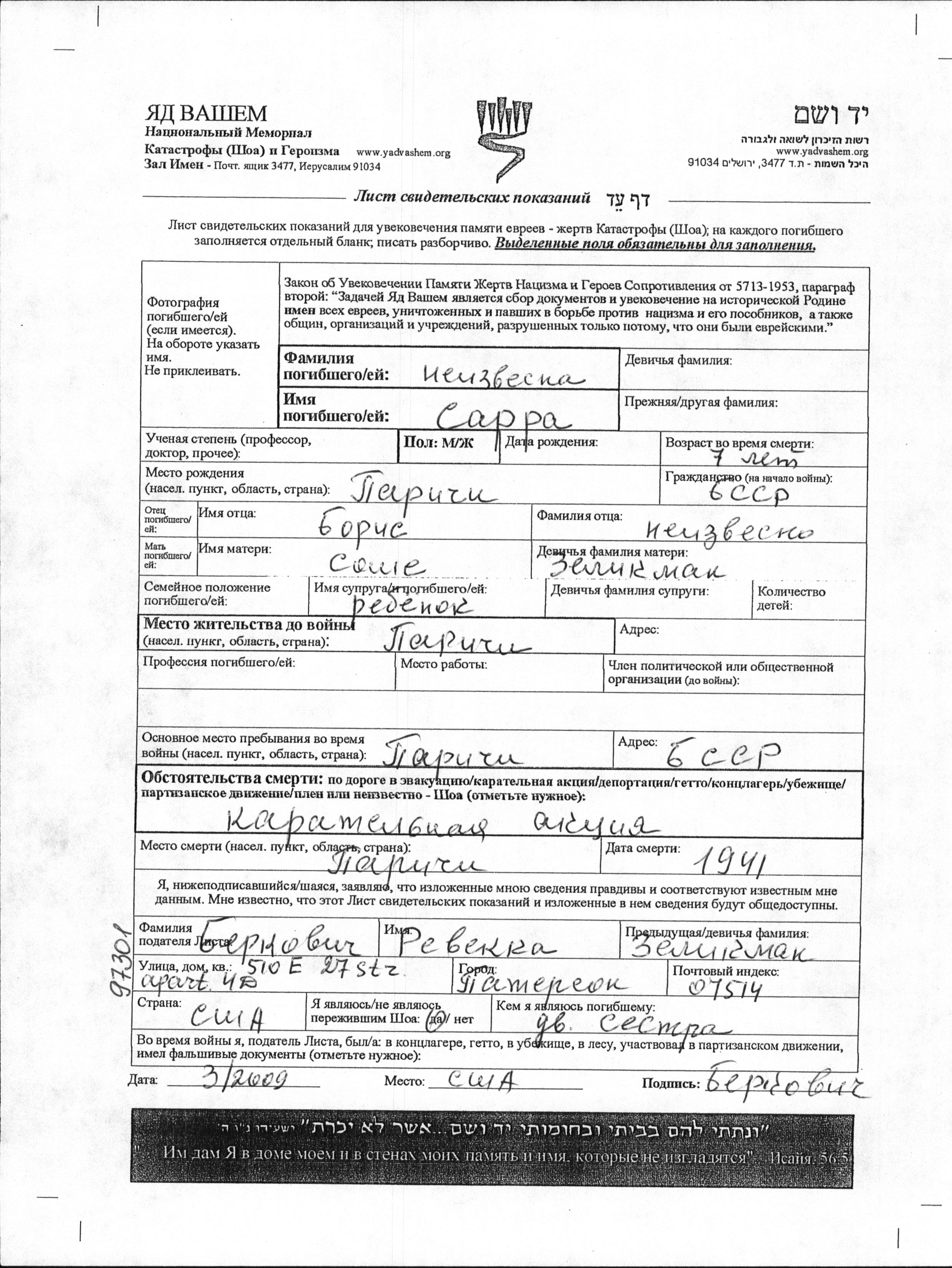 Фамилия неизвестна Сарра Паричи, Белоруссия (СССР) Лист свидетельских показаний