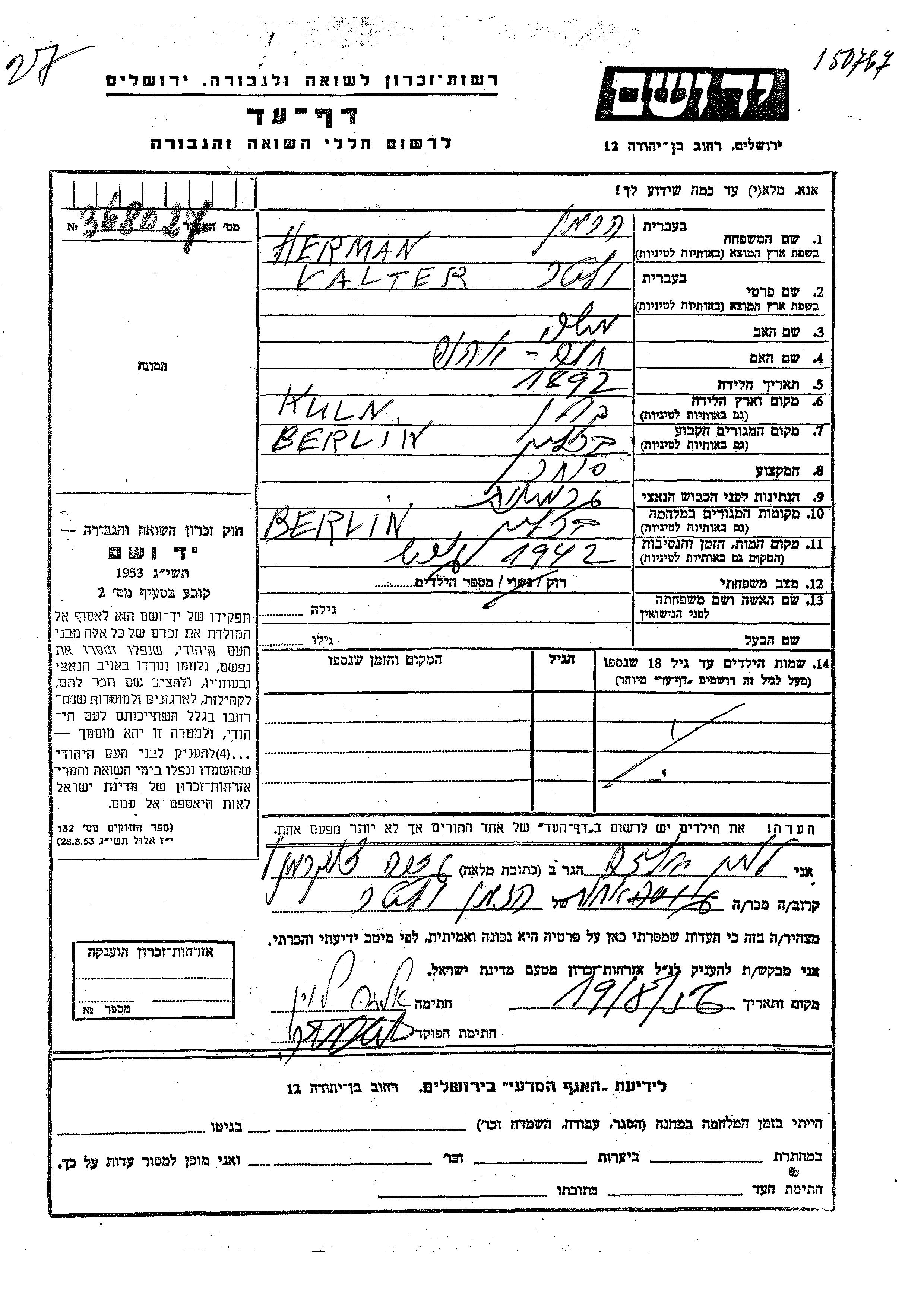 Вальтер Херман, место рождения: Кёльн, Германия. Отец: Моше, mать:Хая Иохана. Торговец / торговка. Холост / не замужем. Место жительства до войны: Берлин, Германия. Место во время войны: Берлин, Германия.