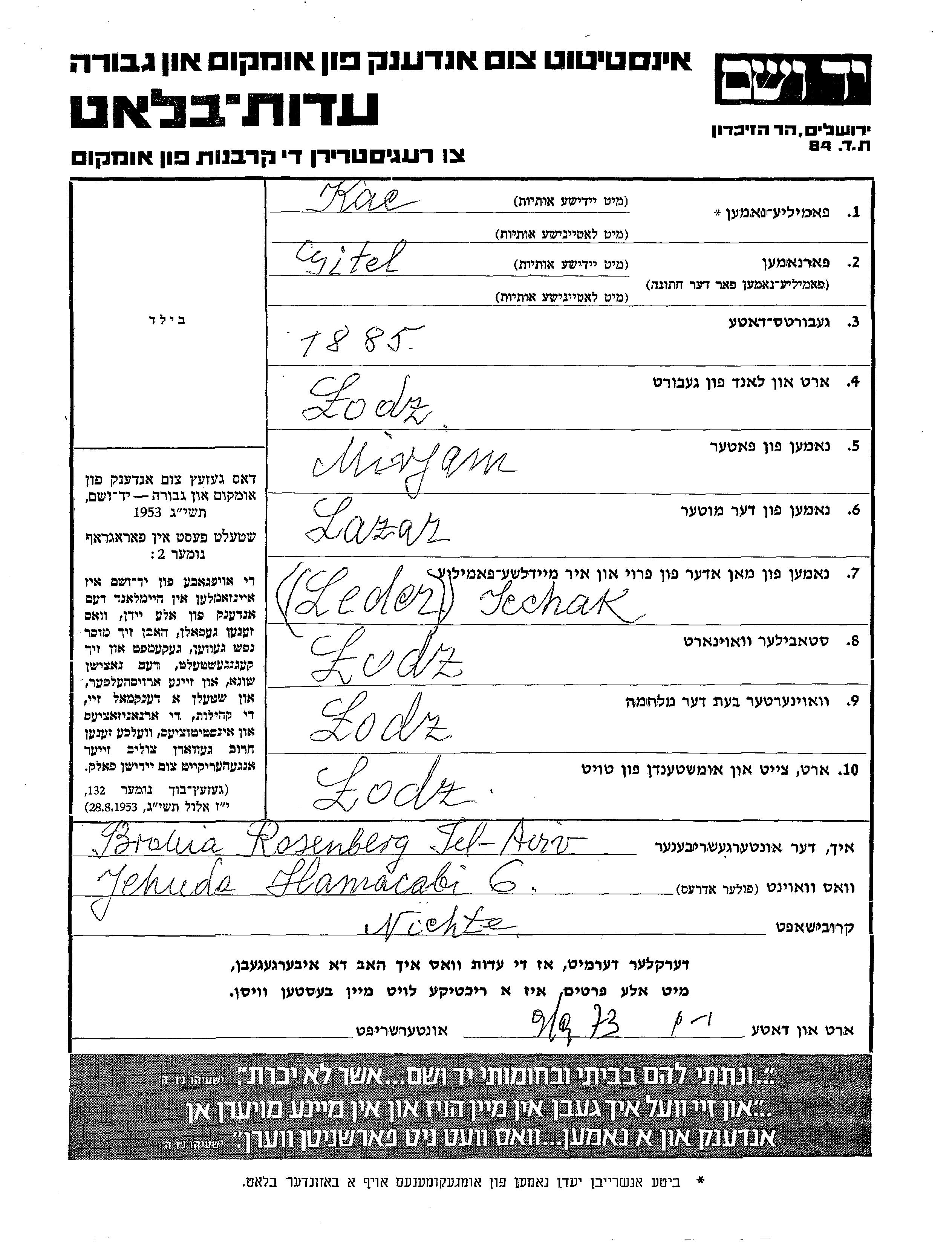 Кац Ледер Гитель 1885 Лодзь, Польша Лист свидетельских показаний