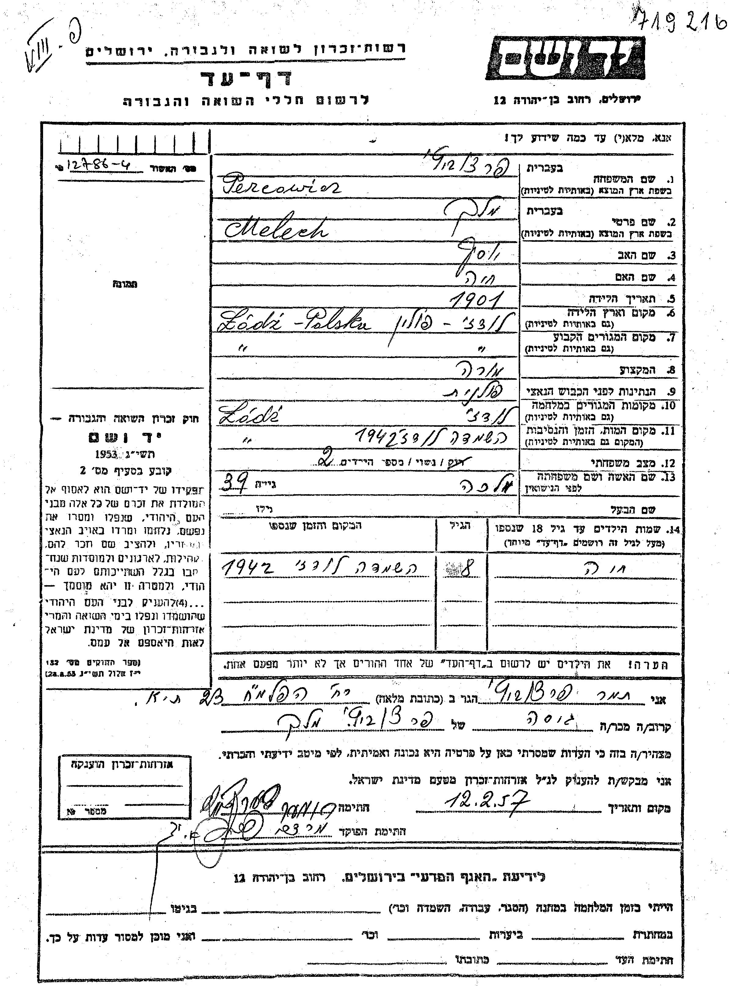 Перцович Хая Лодзь, Польша Лист свидетельских показаний
