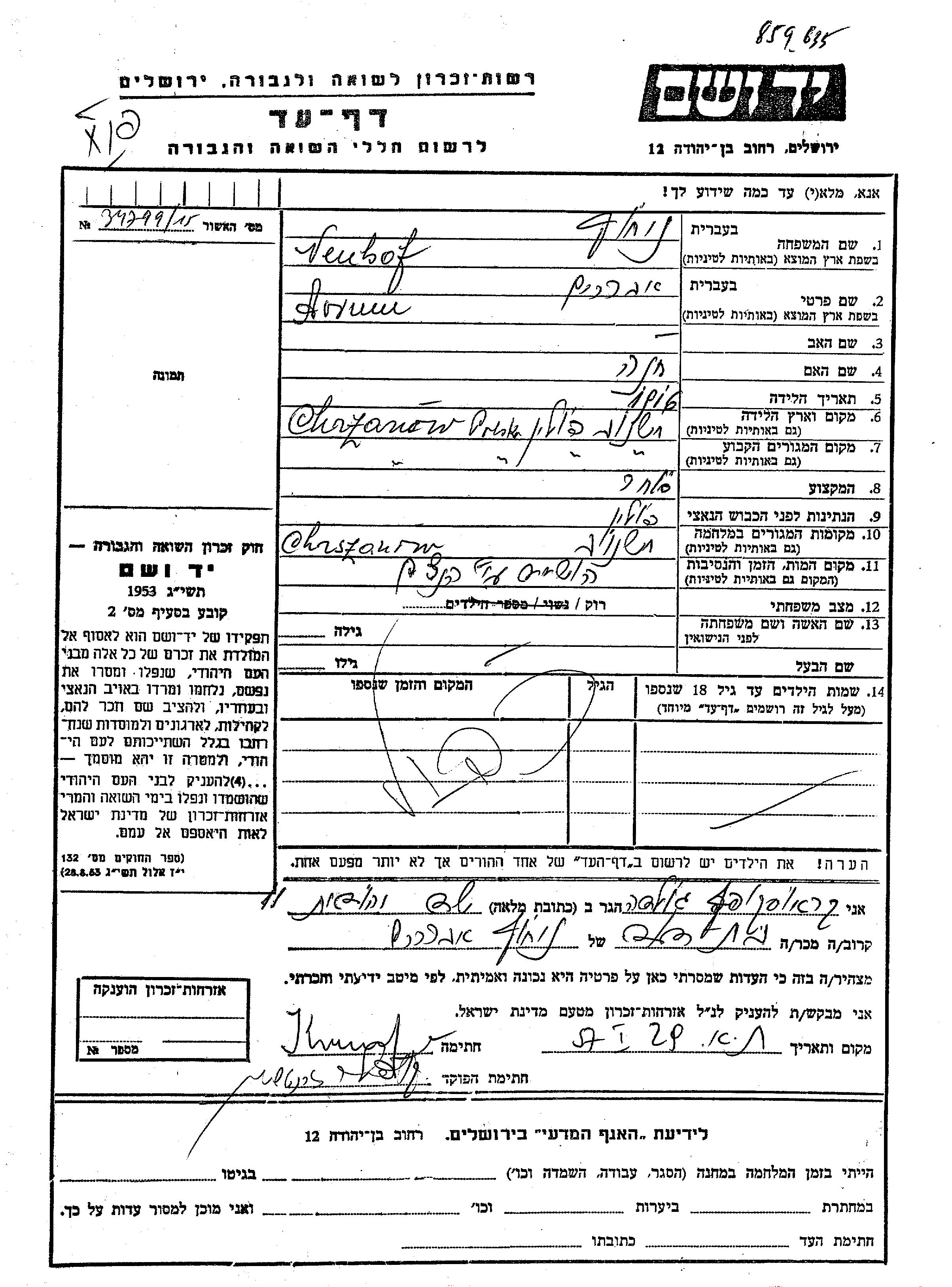 Нойхоф Аврум 1916 Хшанув, Польша Лист свидетельских показаний