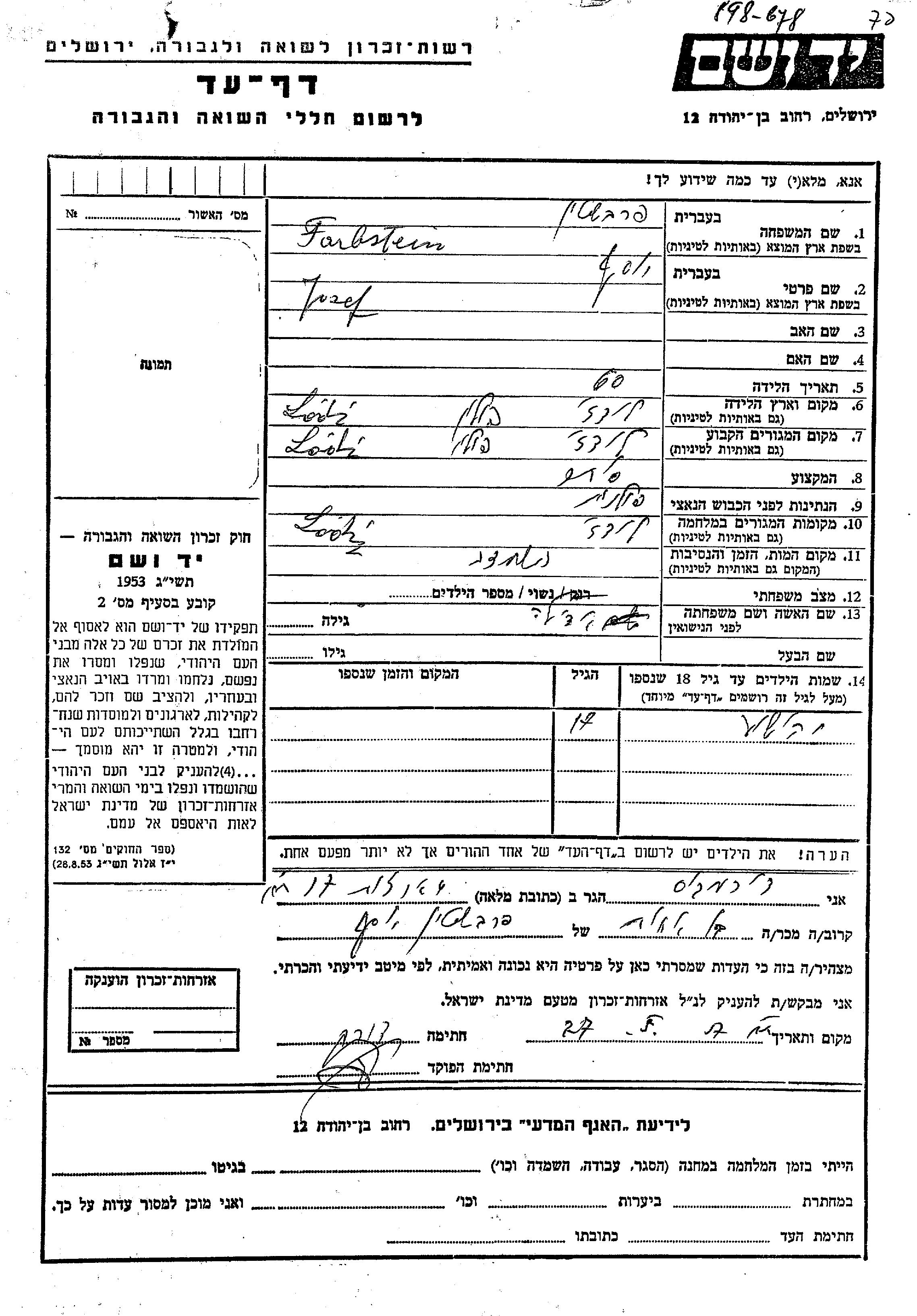 Фарбштайн Иегошуа Лодзь, Польша Лист свидетельских показаний