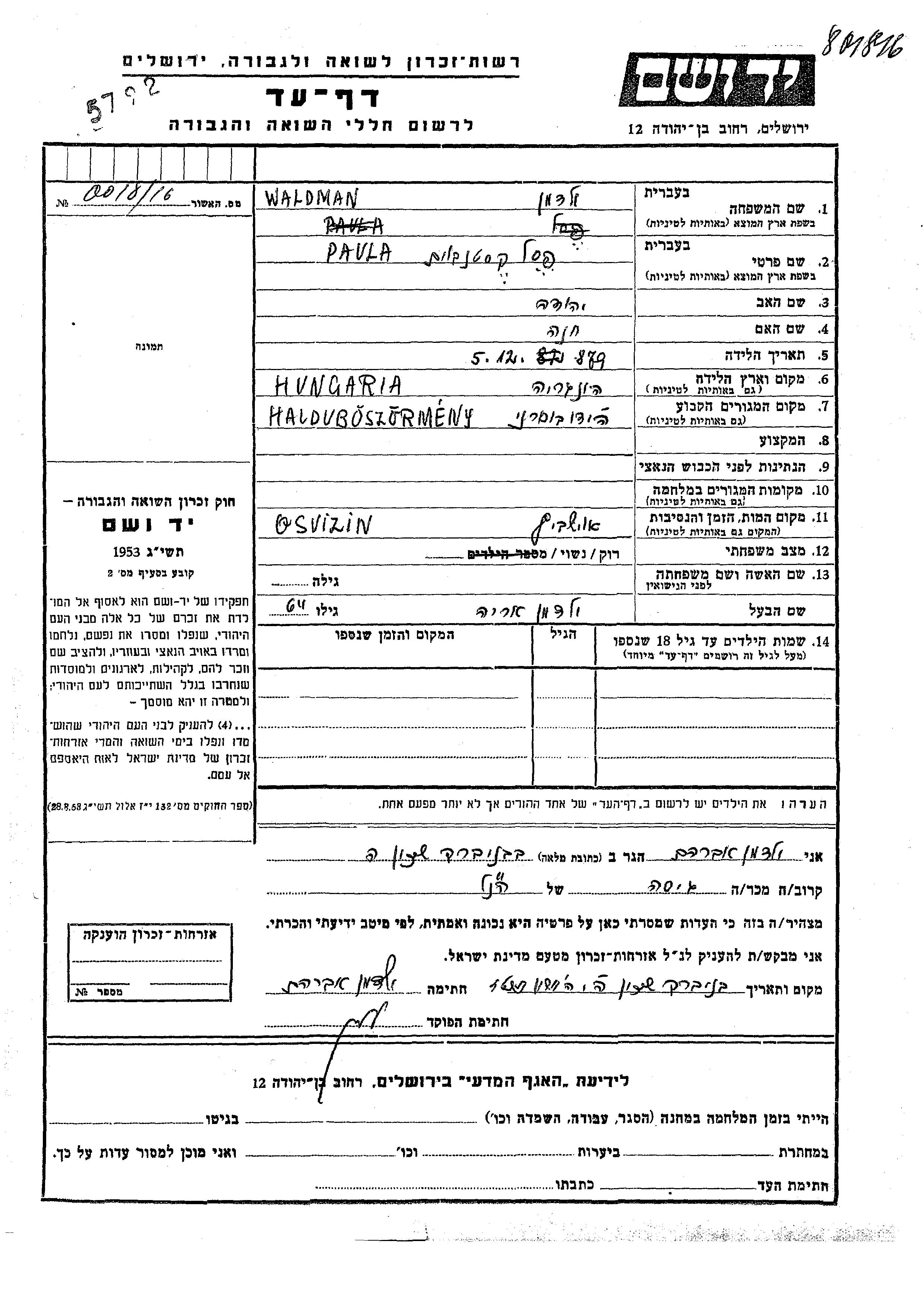 Песель Паула Вальдман, девичья фамилия Кастенбаум, место рождения: Венгрия. Отец: Иегуда, mать:Хана. Место жительства до войны: Хайду Бёсёрмень, Венгрия.