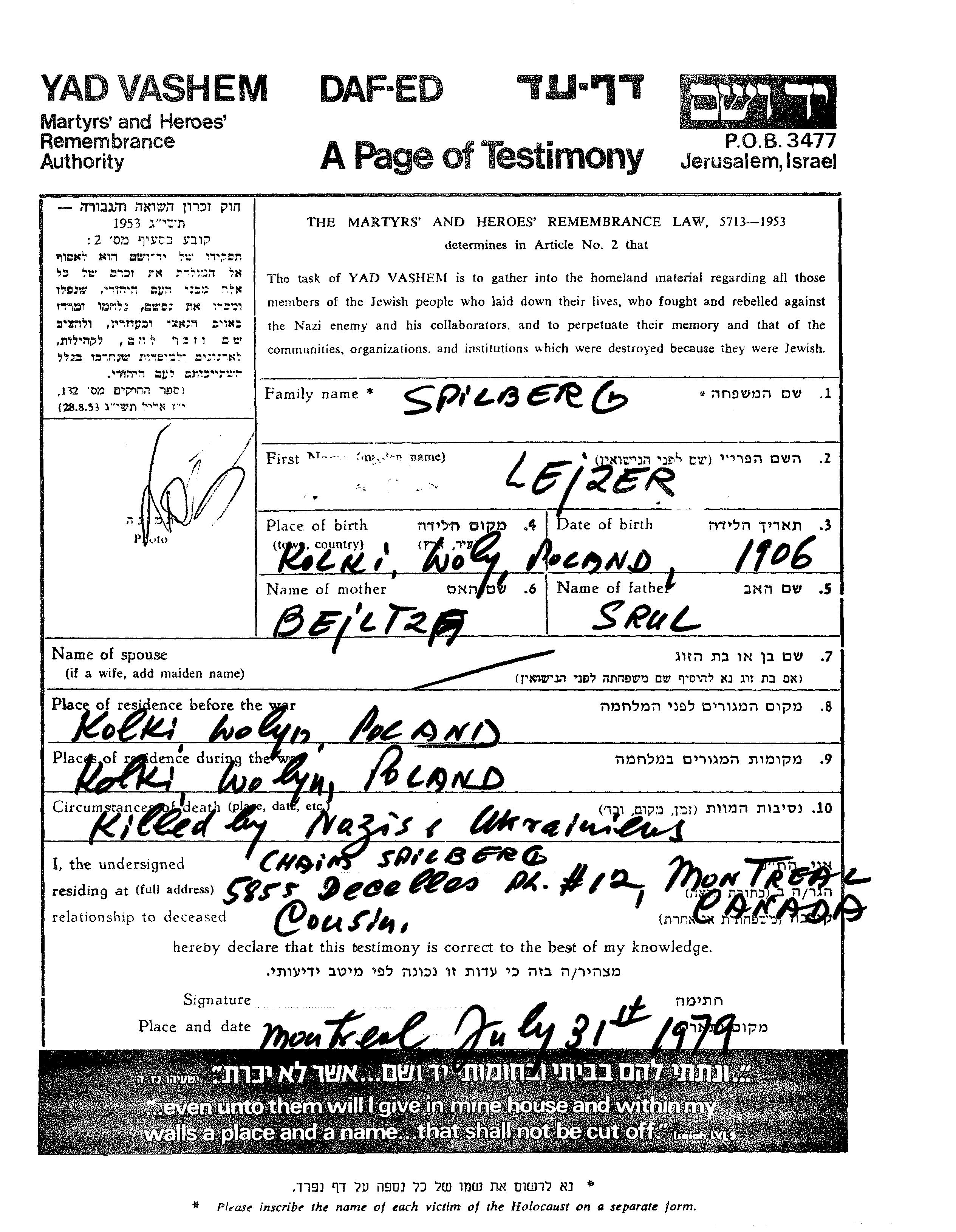 Лейзер Спильберг, место рождения: Колка, Польша. Отец: Сруль, mать:Бейльца. Место жительства до войны: Колка, Польша. Место во время войны: Колка, Польша.