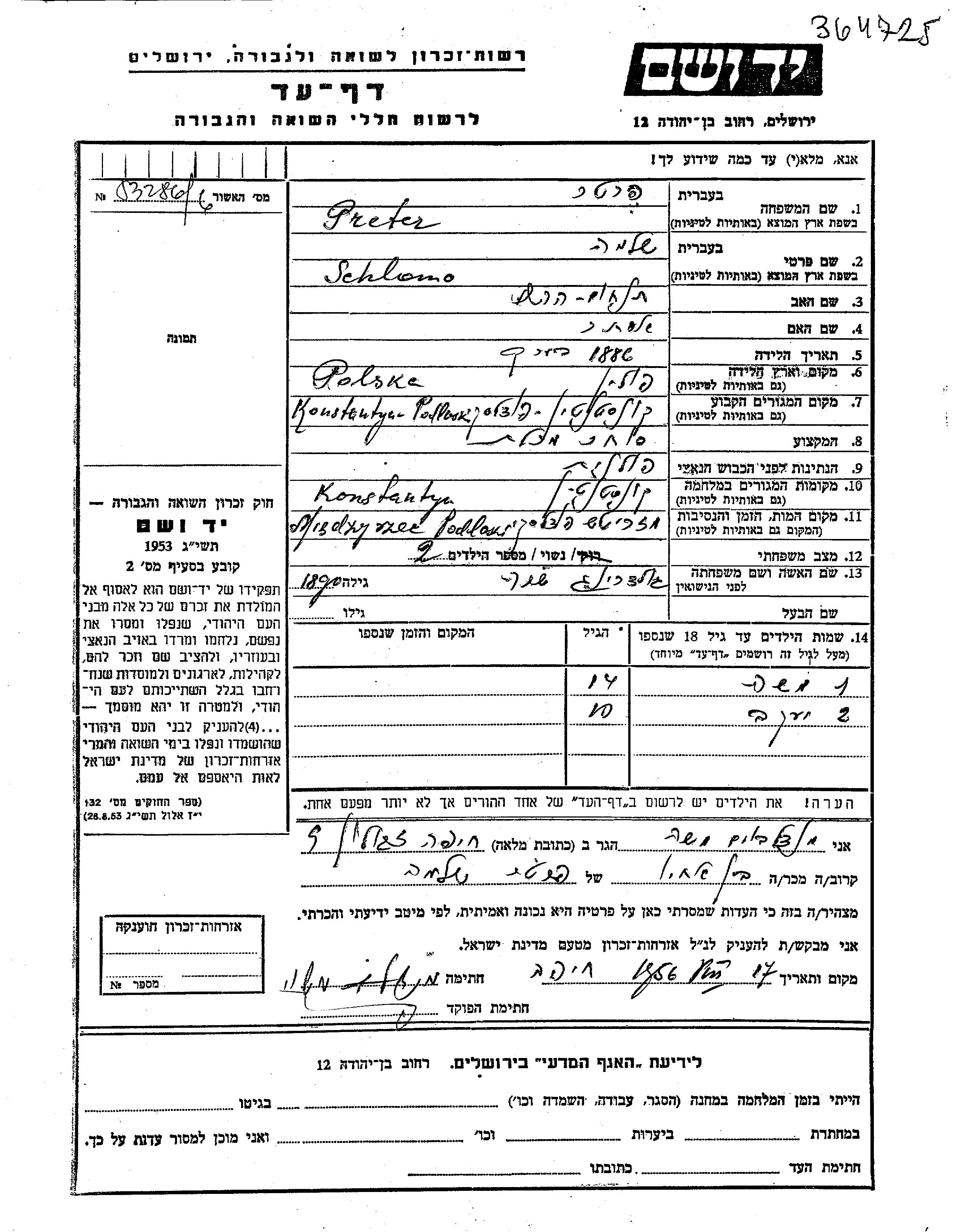 Моше Претер Фратер Шломо Сара девичья фамилия Гольдринг. Ребенок. Место жительства до войны: Константин, Польша. Место во время войны: Константин, Польша.