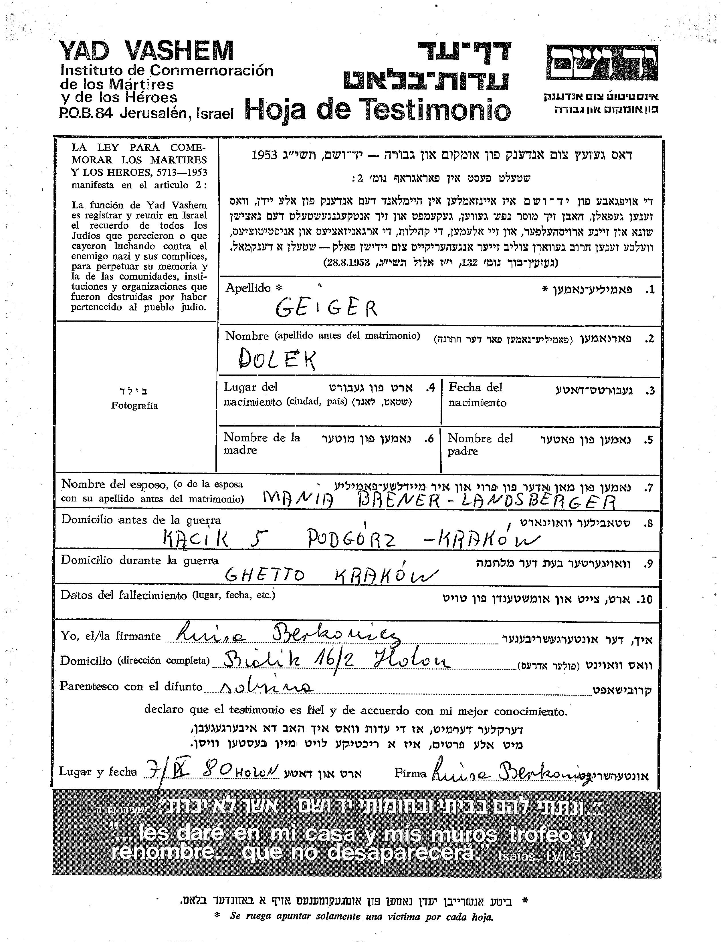 Долек Гейгер. Женат / замужем. Место жительства до войны: Краков, Польша. Место во время войны: Краков, Польша.