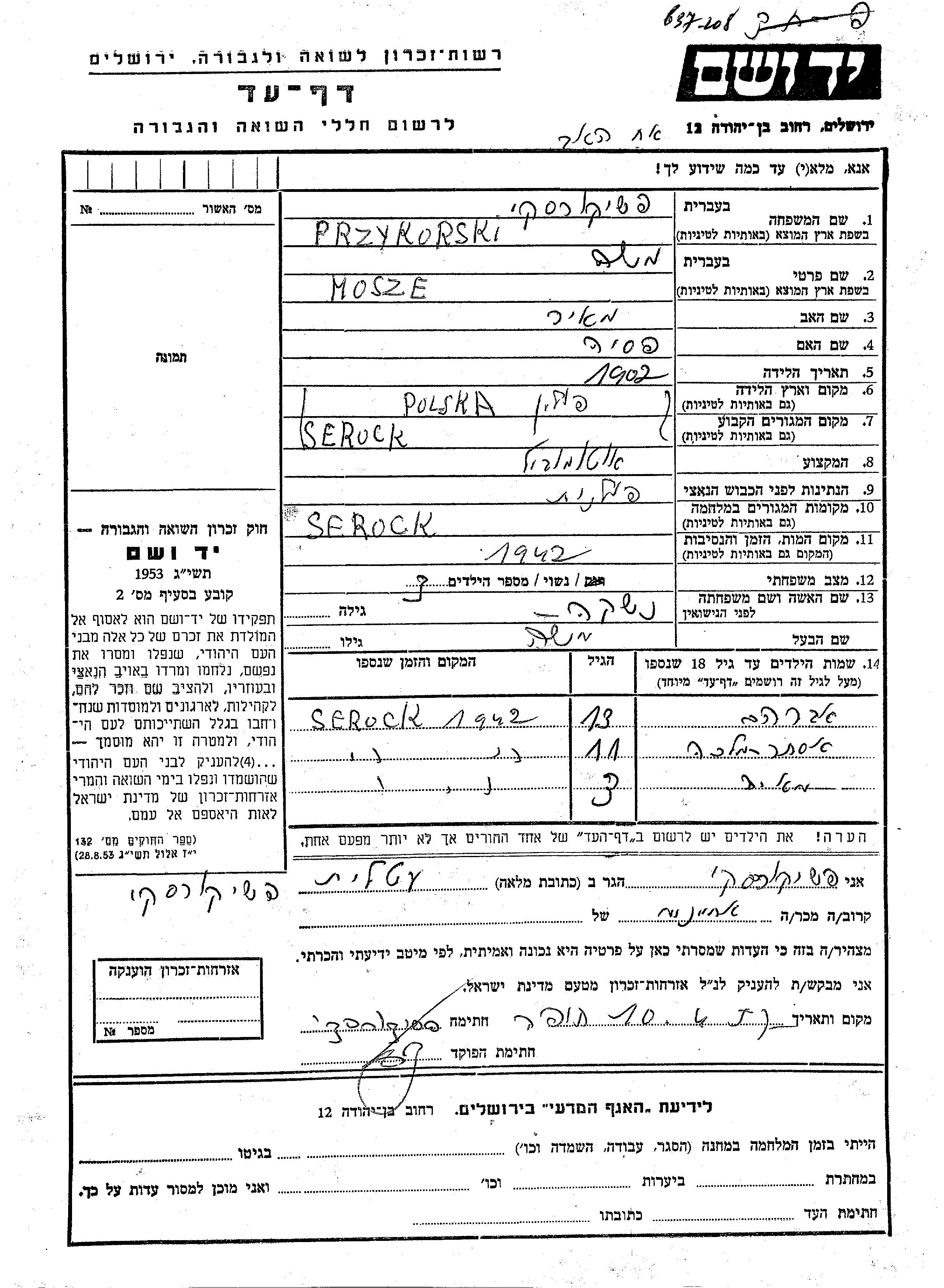 Пшикорски Эстер Малка Сероцк, Польша Лист свидетельских показаний