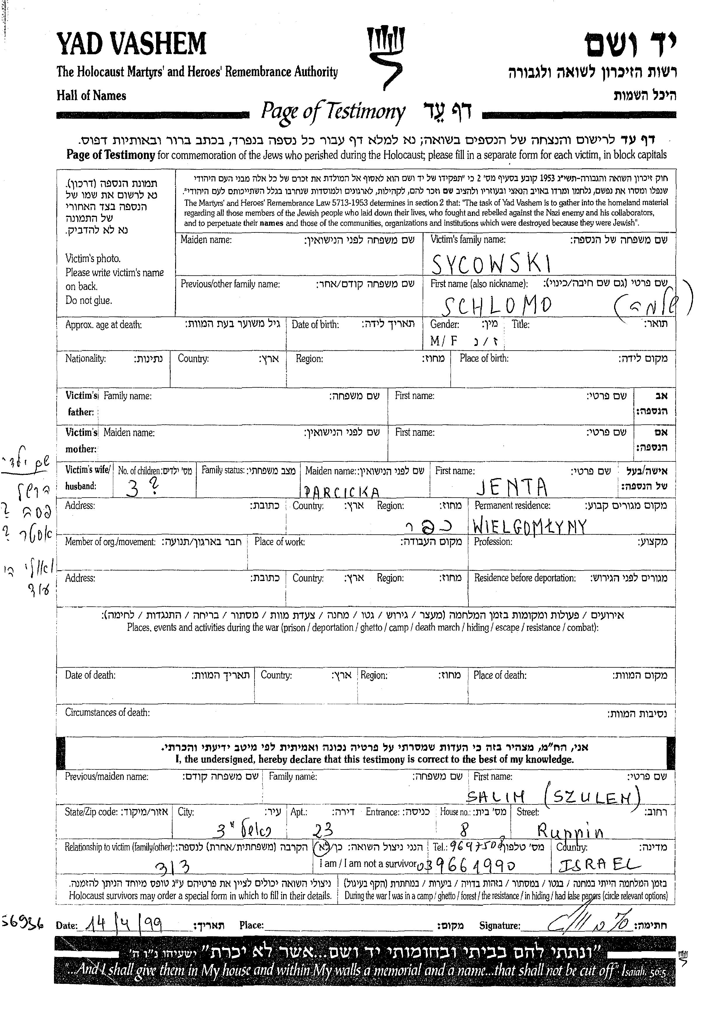 Яд Вашем - Листы свидетельских показаний Мемориального фонда