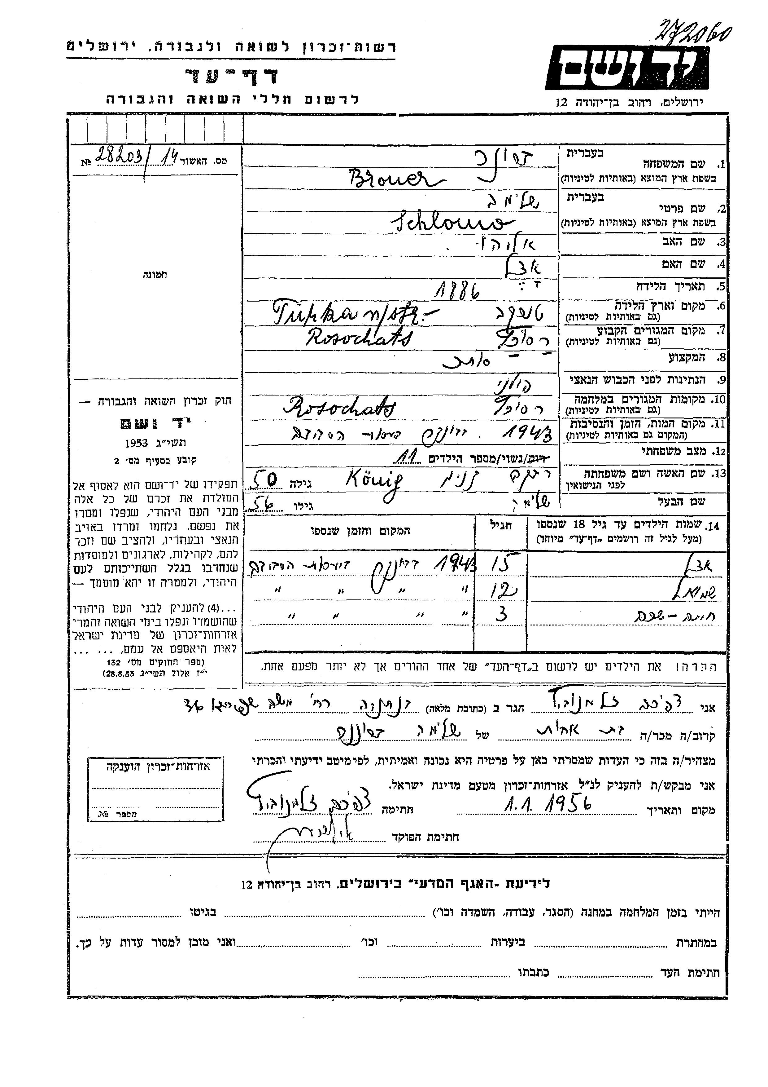 Шмуэль Бронер Шломо Ривка девичья фамилия Кониг. Ребенок. Место жительства до войны: Росохач, Польша. Место во время войны: Росохач, Польша.