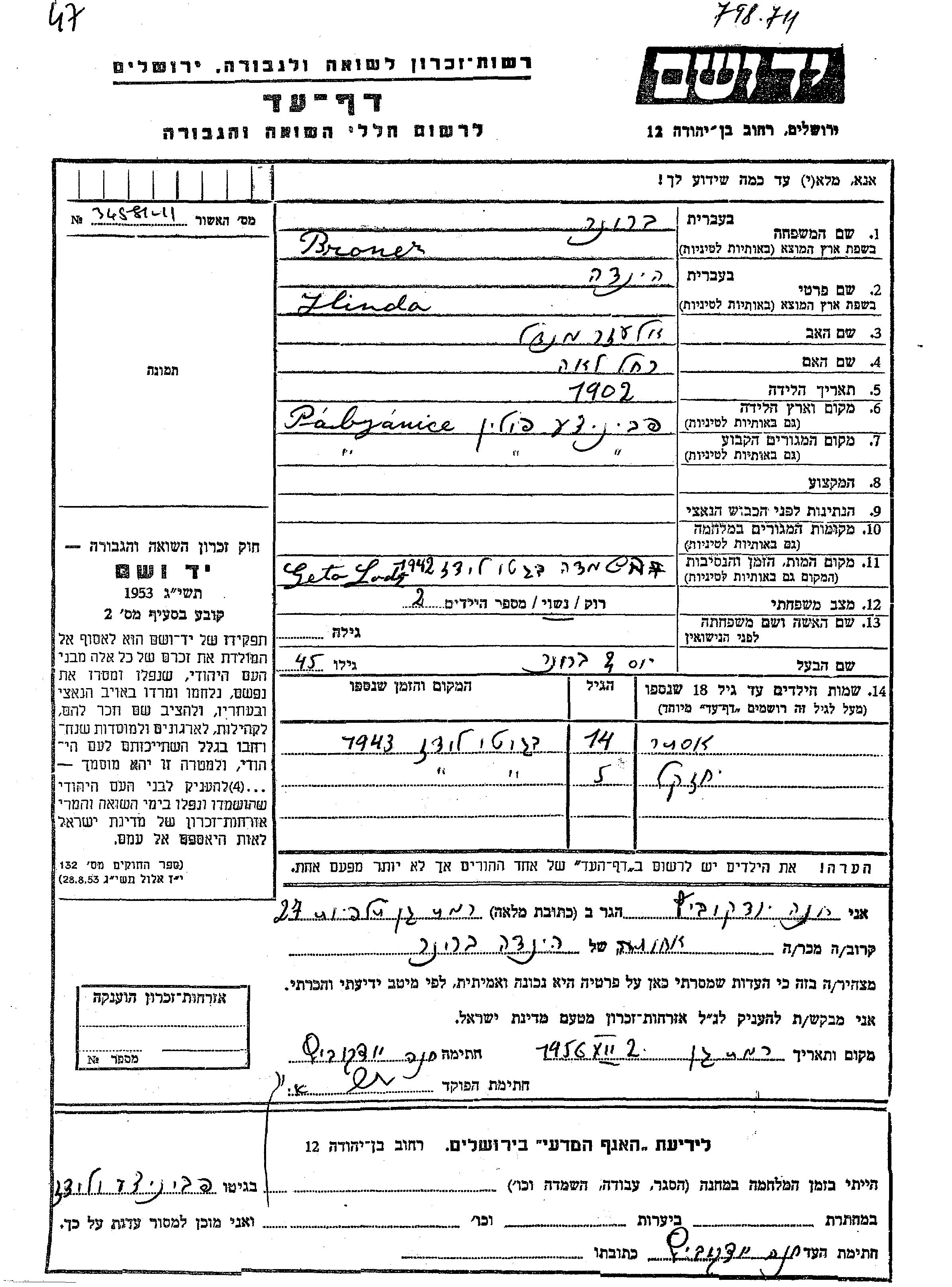 Бронер Иехезкель Пабьянице, Польша Лист свидетельских показаний