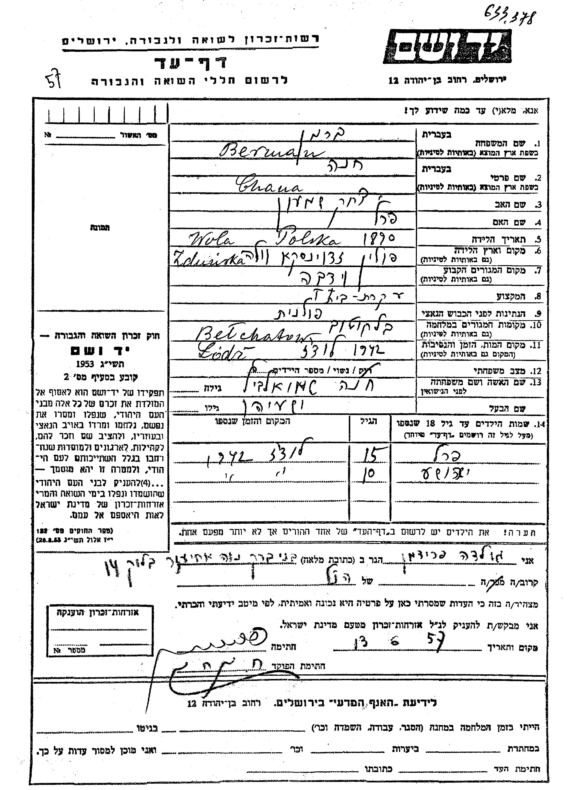 Перел Берман Иешаягу Хана девичья фамилия Шмулевиц. Ребенок. Место жительства до войны: Олыка, Польша. Место во время войны: Белхатув, Польша.