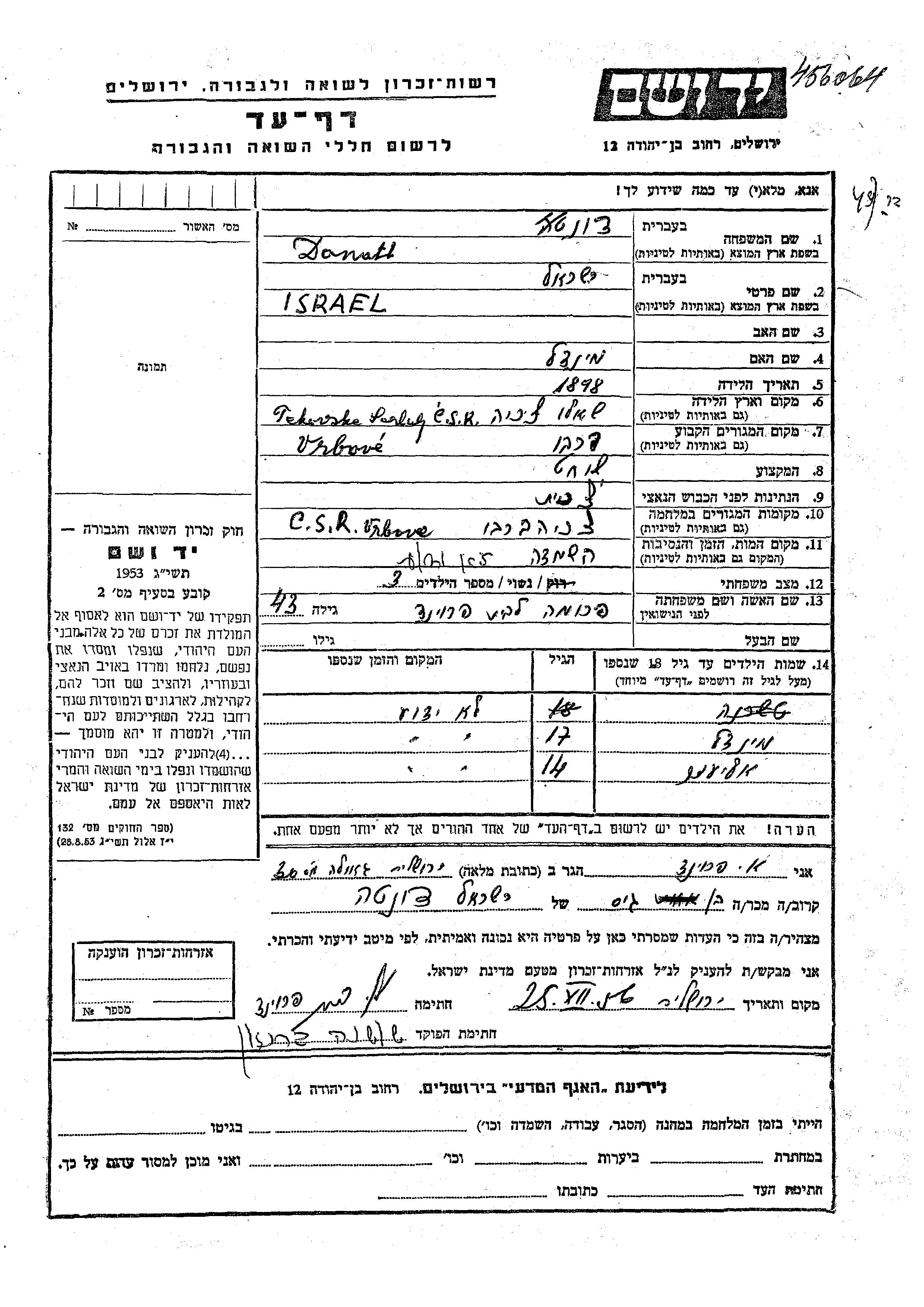 Яд Вашем - Листы свидетельских показаний Мемориального фонда