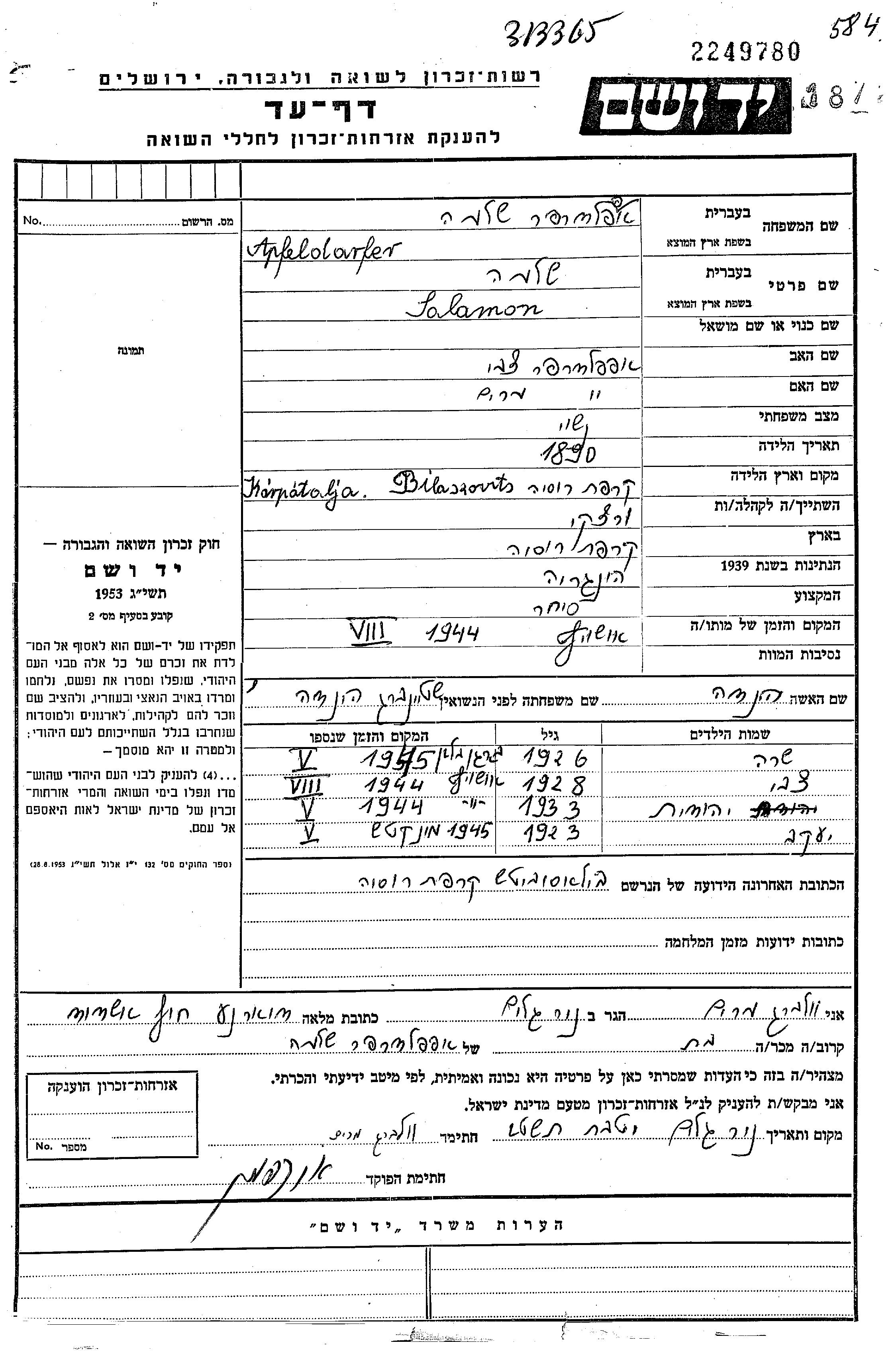 Апфельдорфер Цви 1928 Биласовица, Чехословакия Лист свидетельских показаний