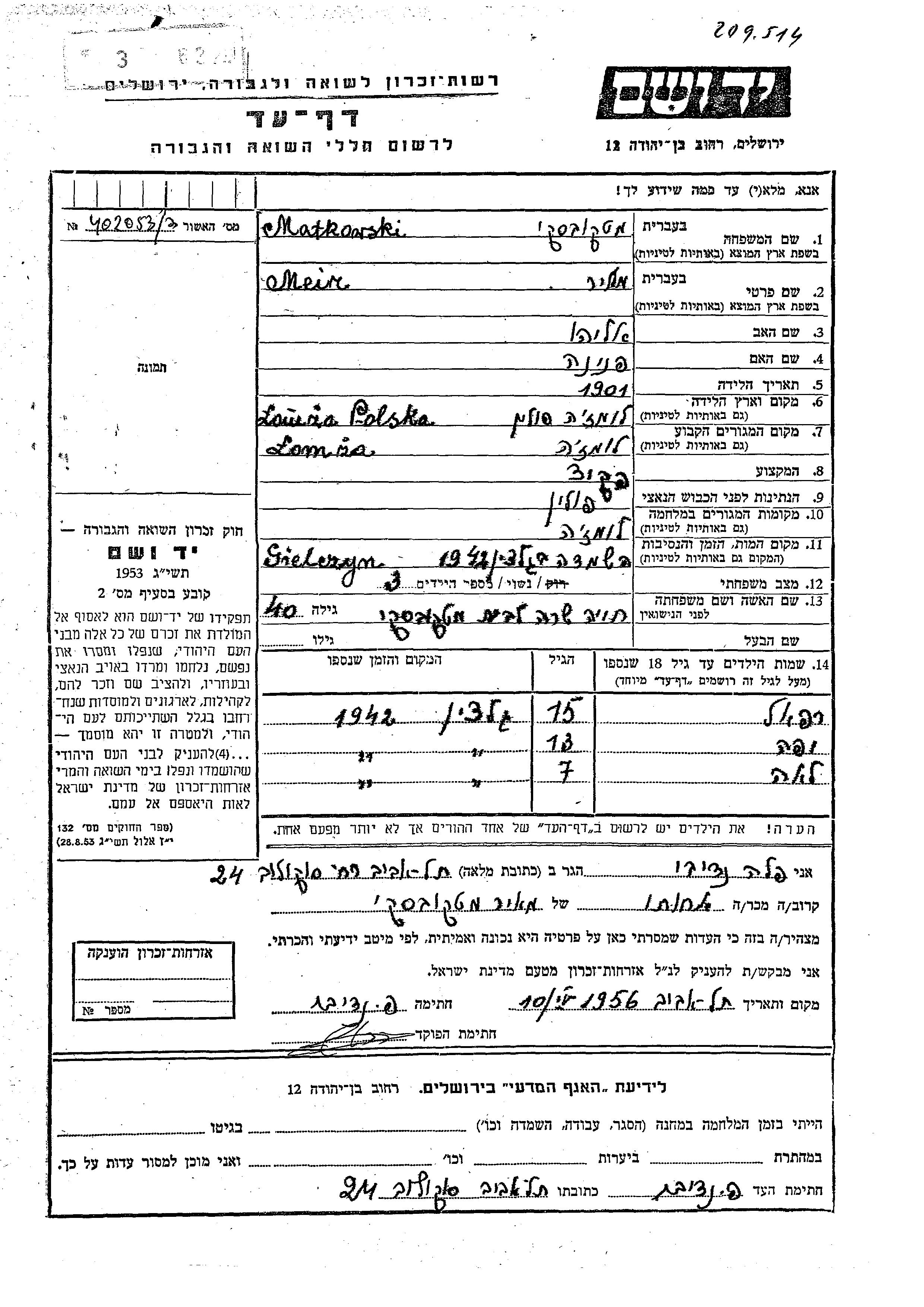 Матковски Лея Ломжа, Польша Лист свидетельских показаний