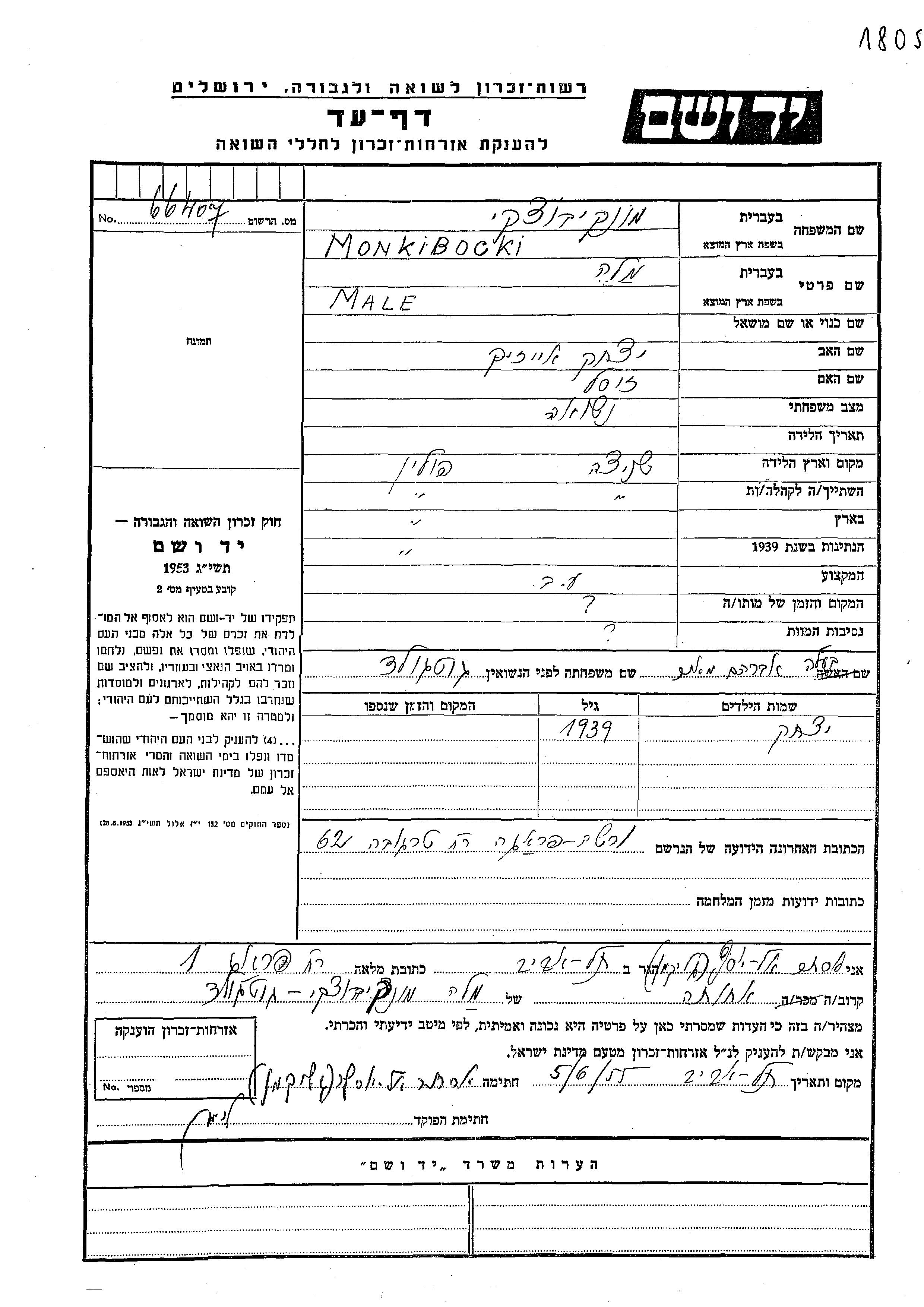 Монкибоцки Ицхак 1939 место не указано, Лист свидетельских показаний