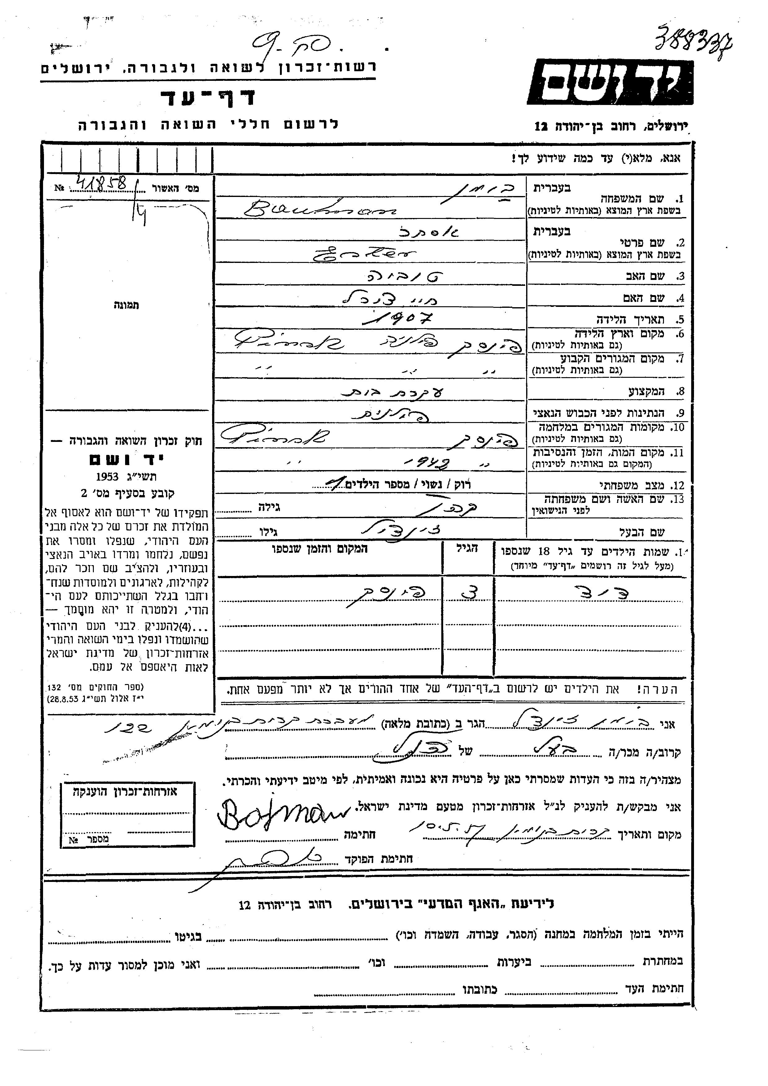 Бауман Давид Пинск, Польша Лист свидетельских показаний