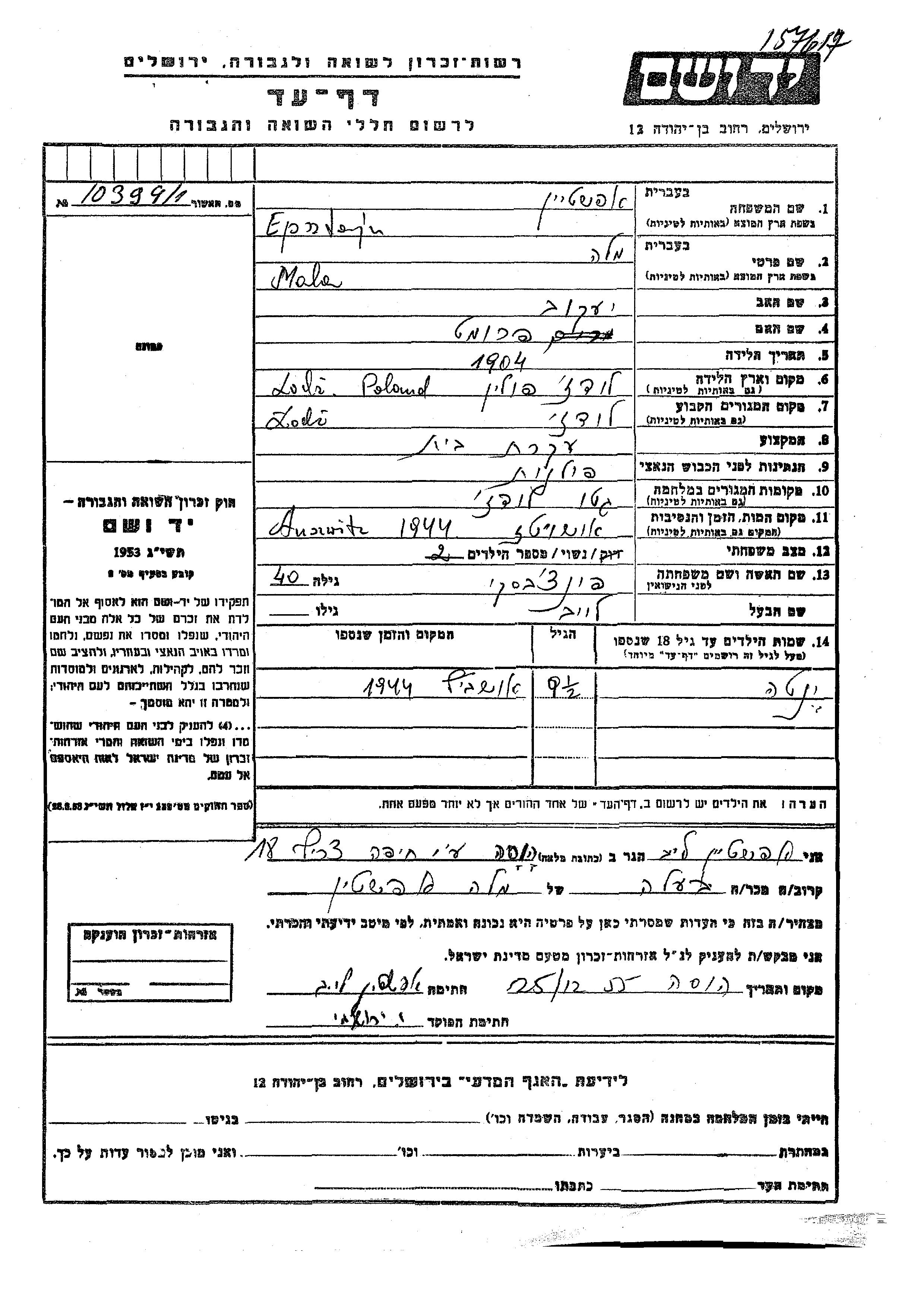Эпштайн Ента Лодзь, Польша Лист свидетельских показаний