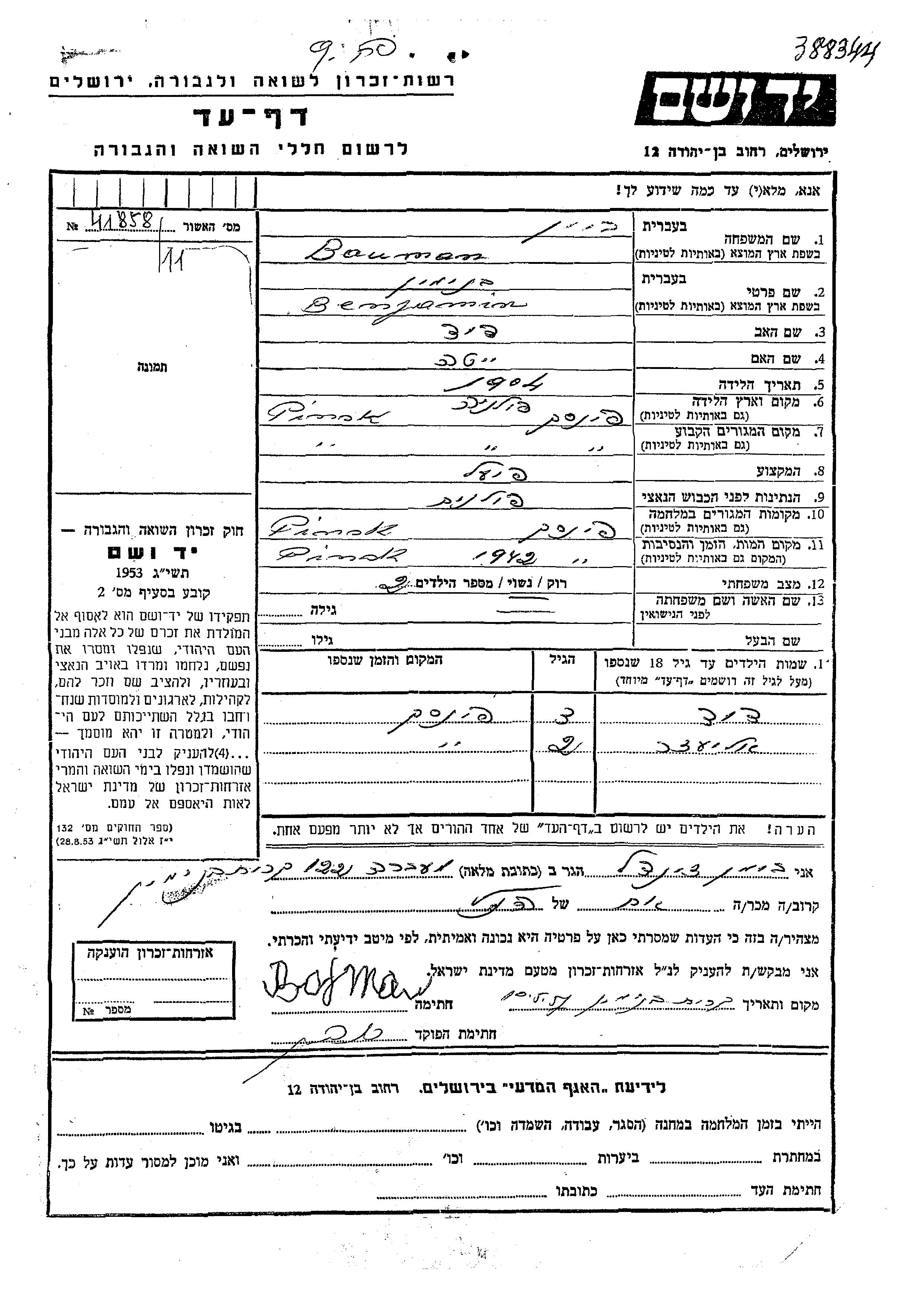 Давид Бауман Беньямин. Ребенок. Место жительства до войны: Пинск, Польша. Место во время войны: Пинск, Польша.