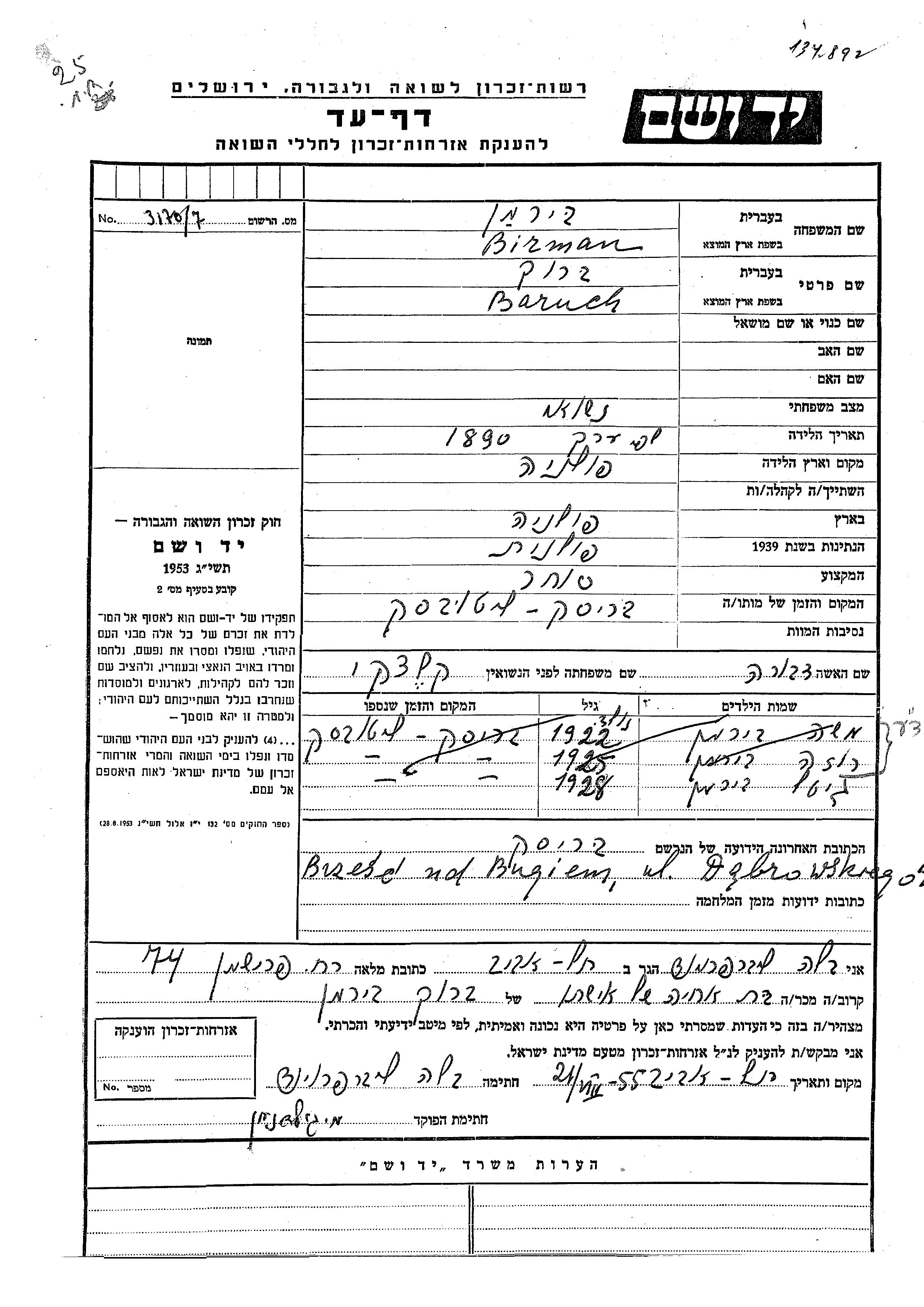 Гитель Бирман Барух Двора девичья фамилия Кашецки. Место жительства до войны: Польша. Место во время войны: Брест Над Бугом, Польша.