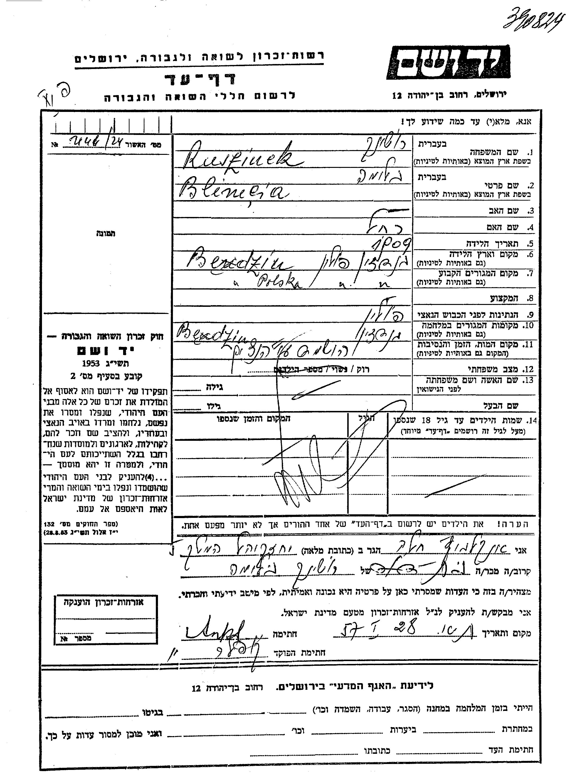 Блюма Рушинек, место рождения: Бендзин, Польша.Mать:Рахель. Холост / не замужем. Место жительства до войны: Бендзин, Польша. Место во время войны: Бендзин, Польша.
