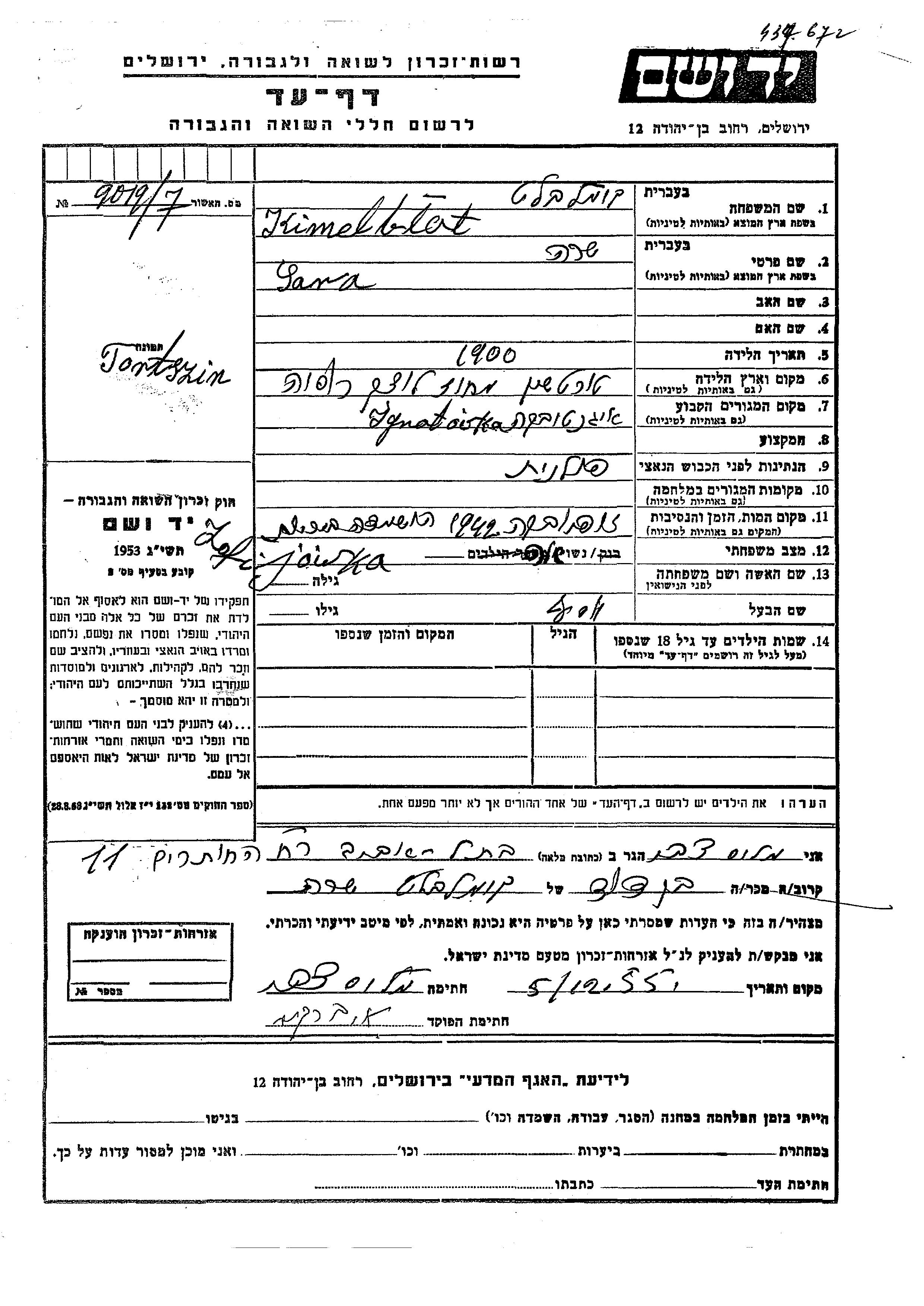 Сара Кимельблат, место рождения: Торчин, Польша. Женат / замужем. Место жительства до войны: Игнатовка, Польша.