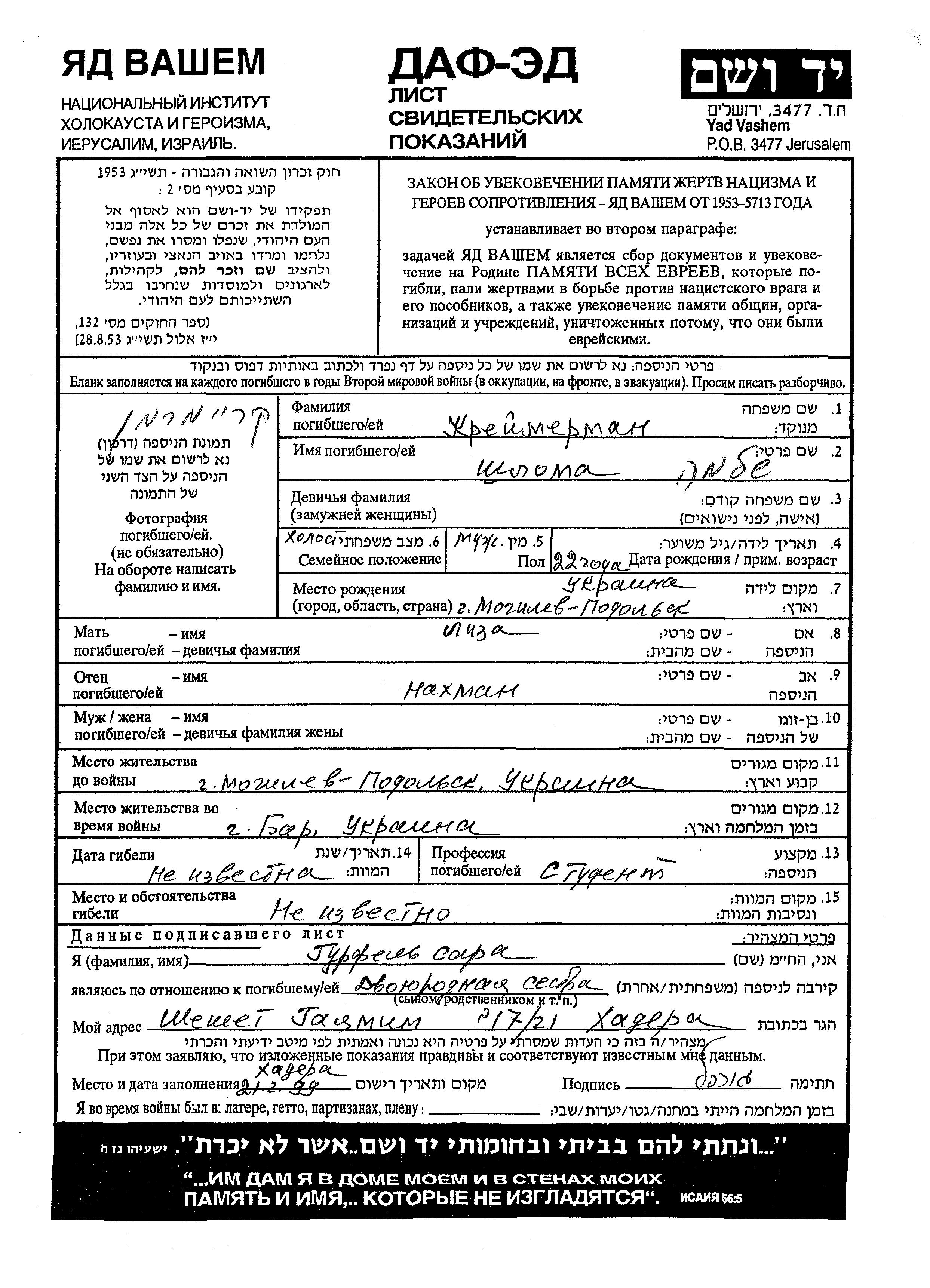 Шлома Креймерман, место рождения: Могилёв-Подольский, Украина (СССР). Отец: Нахман, mать:Лиза. Студент / студентка. Холост / не замужем. Место жительства до войны: Могилёв-Подольский, Украина (СССР). Место во время войны: Бар, Украина (СССР).