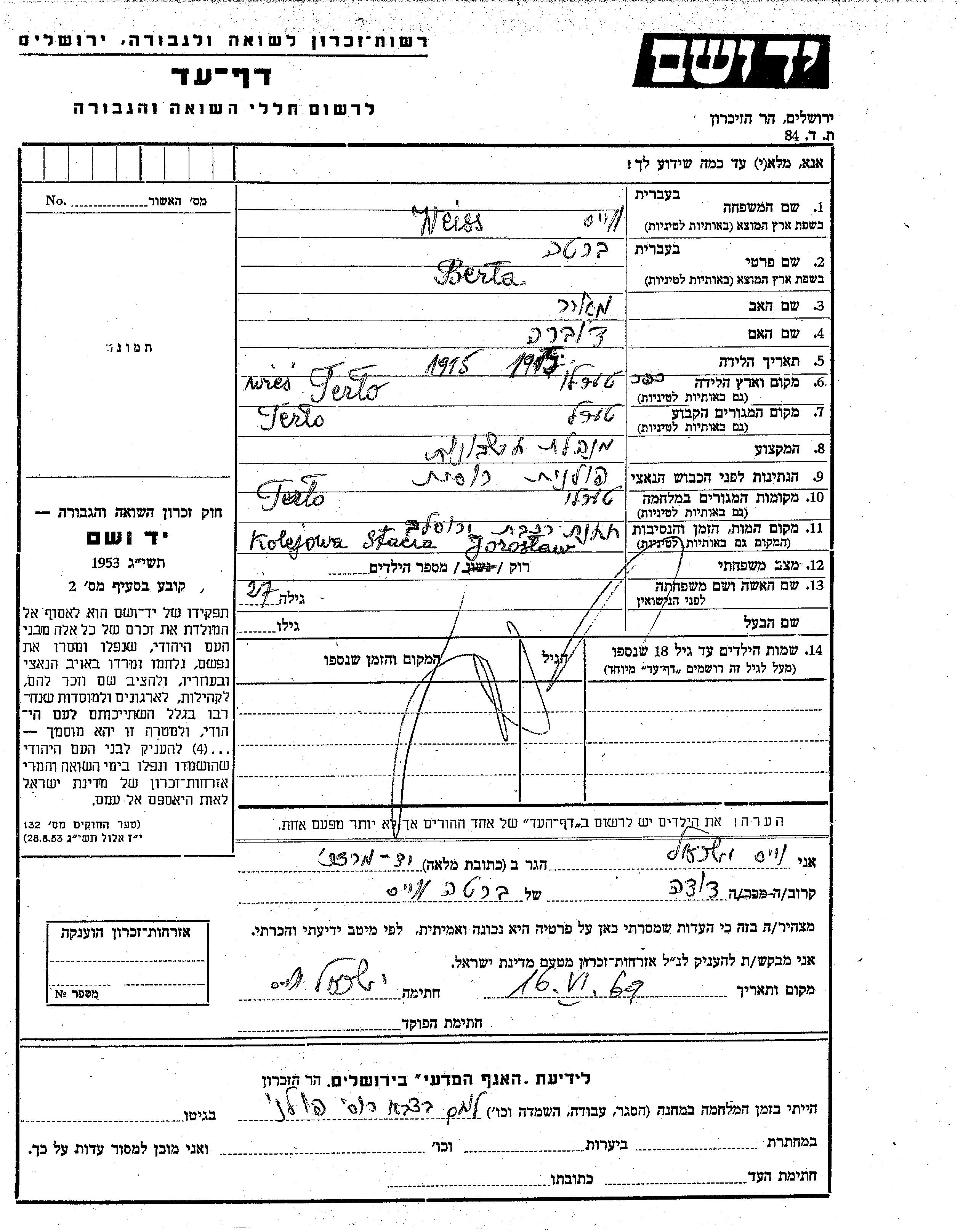 Берта Вайсс, место рождения: Терло, Польша. Отец: Меир, mать:Добра. Бухгалтер / счетовод. Холост / не замужем. Место жительства до войны: Терло, Польша. Место во время войны: Терло, Польша.