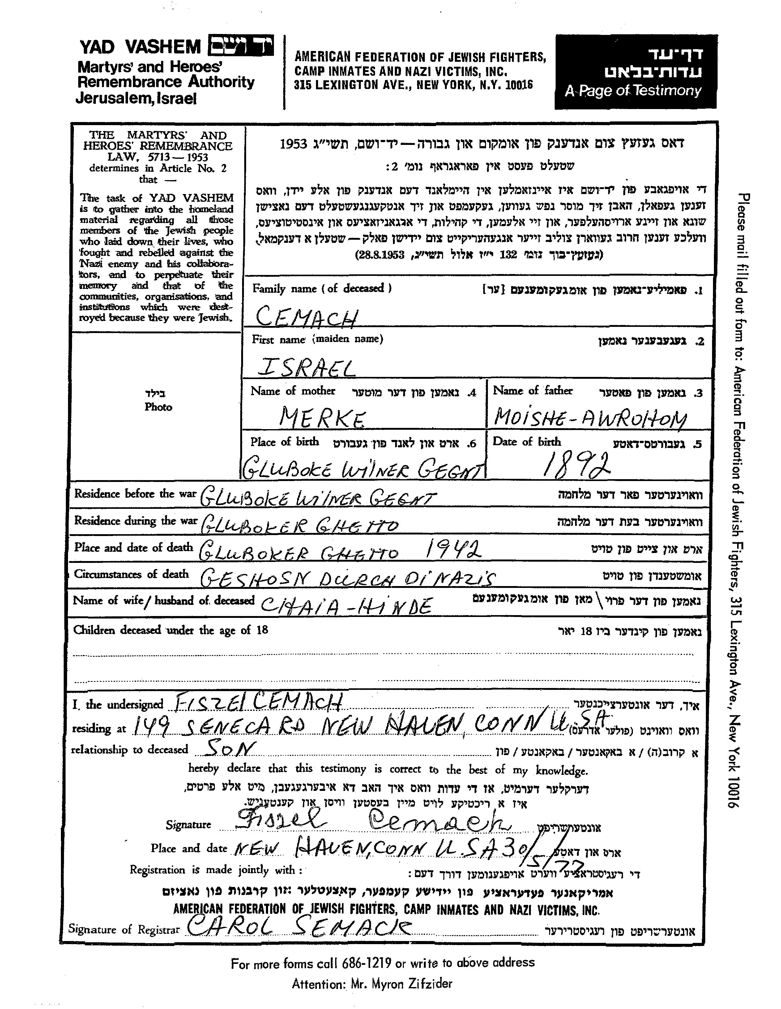 Исраэль Цемах, место рождения: Глембокие, Польша. Отец: Мойше, mать:Мерке Аврохом. Женат / замужем. Место жительства до войны: Глембокие, Польша. Место во время войны: Глембокие, Польша.
