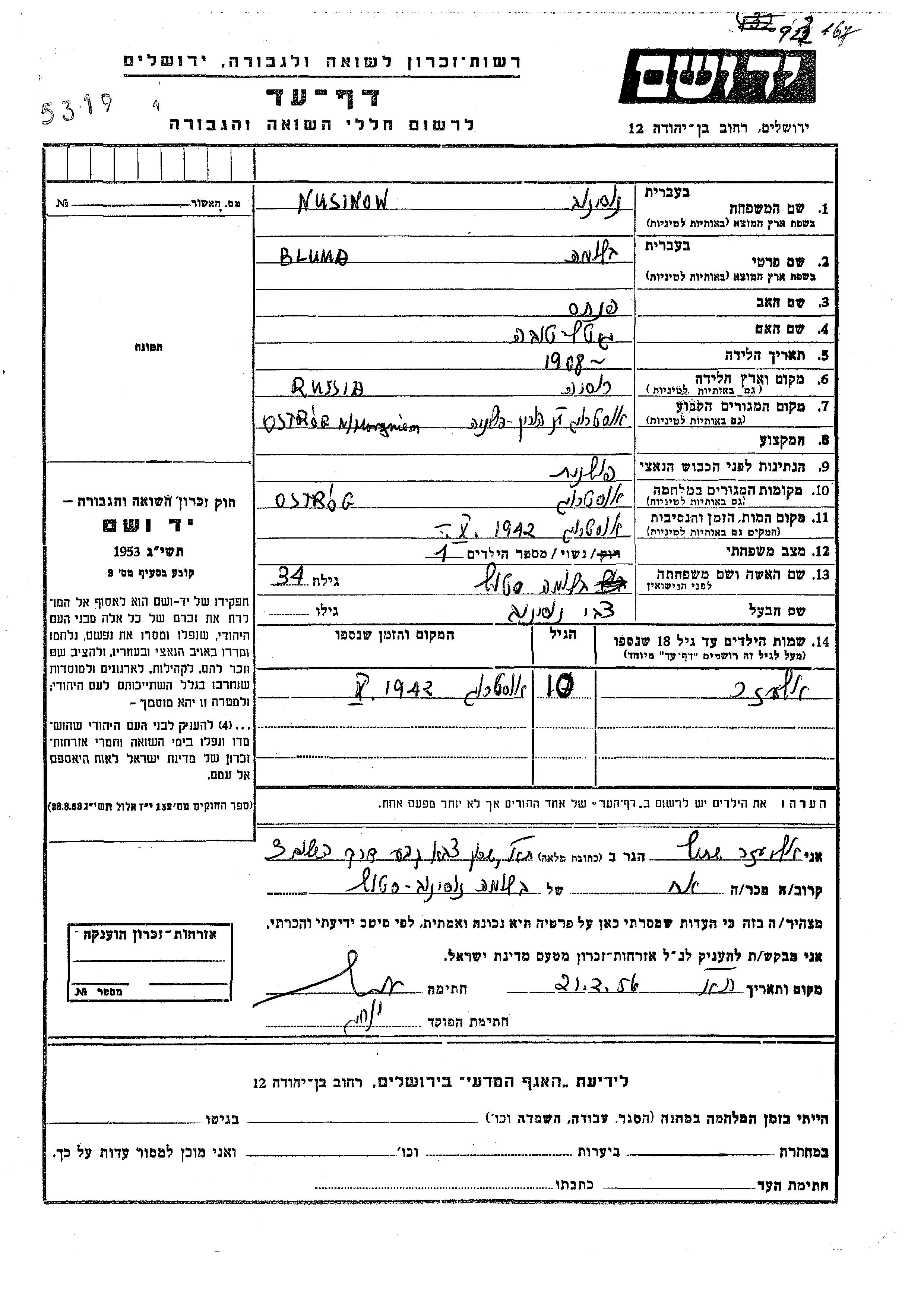 Нусинов Блюма 1908 Острог, Польша Лист свидетельских показаний