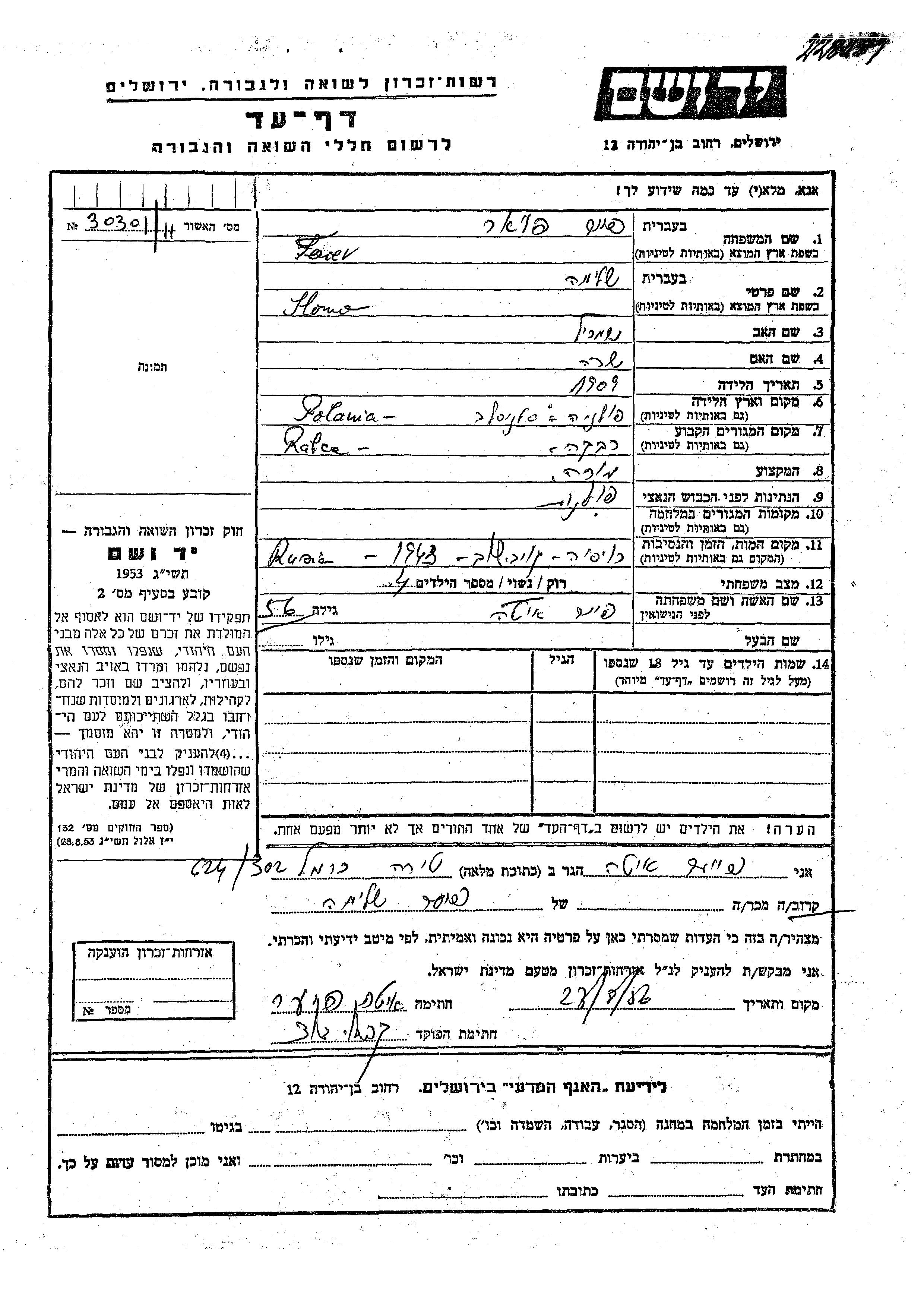 Яд Вашем - Листы свидетельских показаний Мемориального фонда