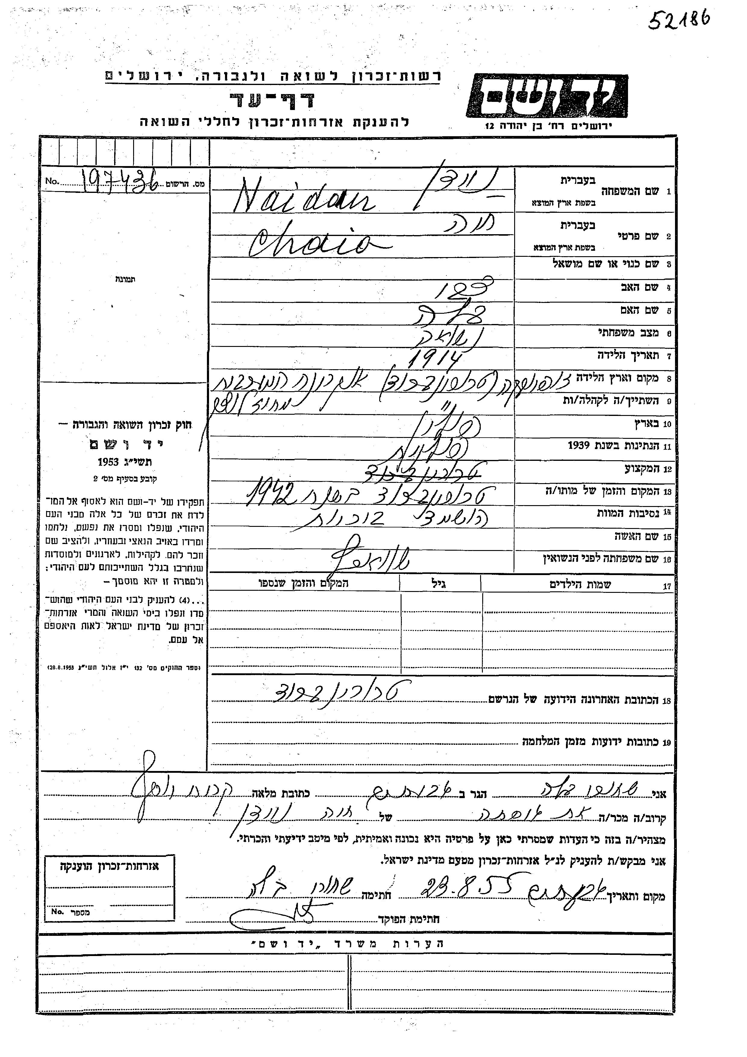 Хая Найдан, девичья фамилия Шварц, место рождения: Трохенброд, Польша. Отец: Цви, mать:Бела. Женат / замужем. Место жительства до войны: Трохенброд, Польша. Место во время войны: Трохенброд, Польша.