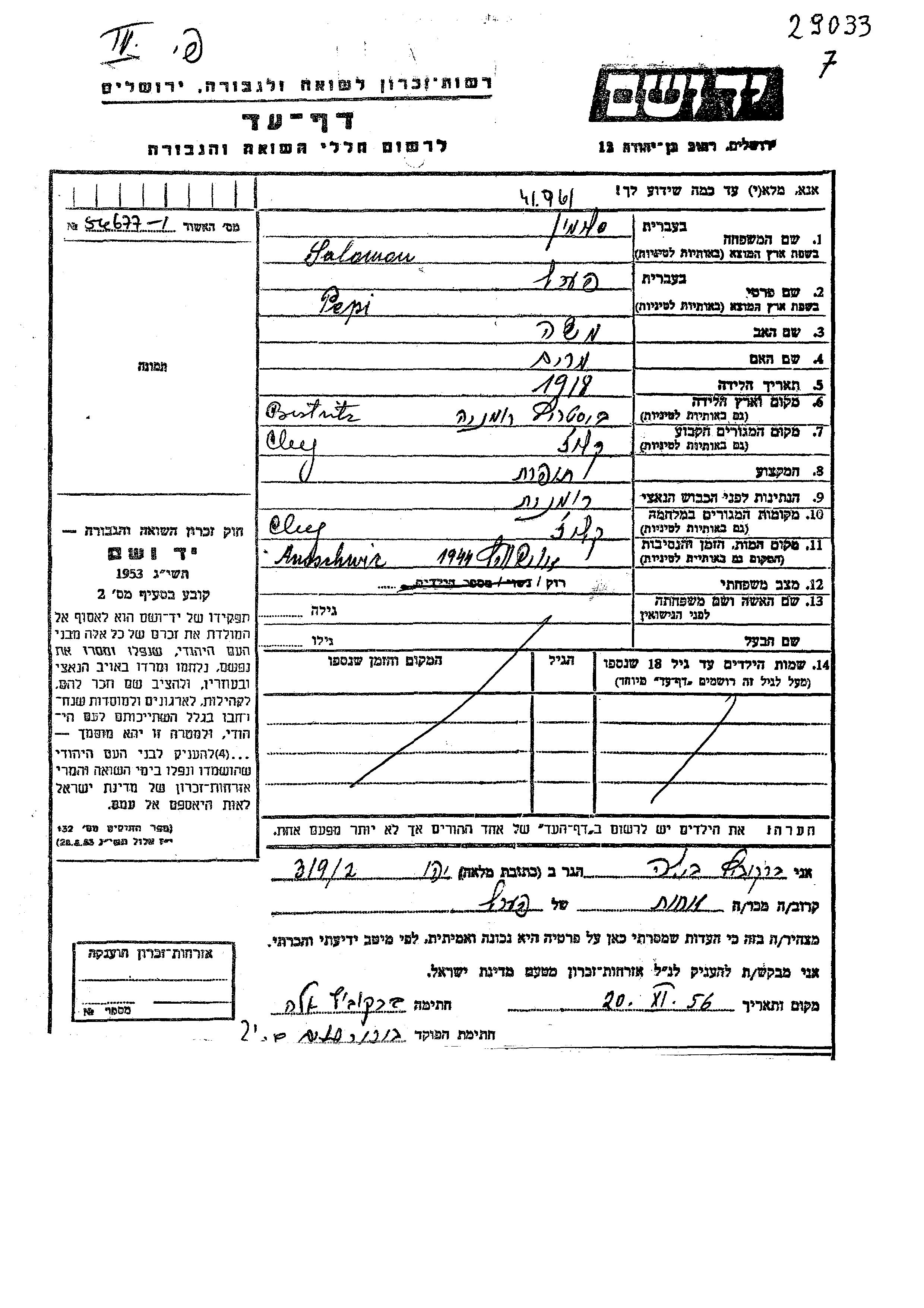Пепи Перл Саломон, место рождения: Бистрица, Румыния. Отец: Моше, mать:Мирьям. Швея. Холост / не замужем. Место жительства до войны: Клуж, Румыния. Место во время войны: Клуж, Румыния.