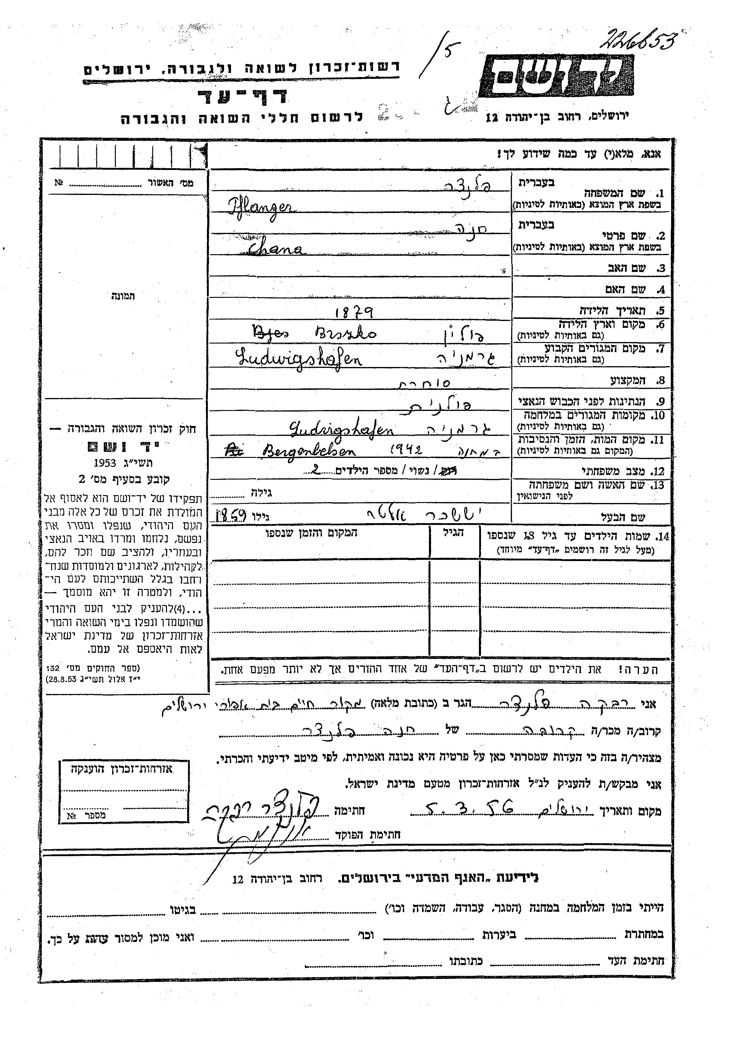 Хана Фланцер, место рождения: Бршко, Югославия. Торговец / торговка. Женат / замужем. Место жительства до войны: Людвигсхафен, Германия. Место во время войны: Людвигсхафен, Германия.